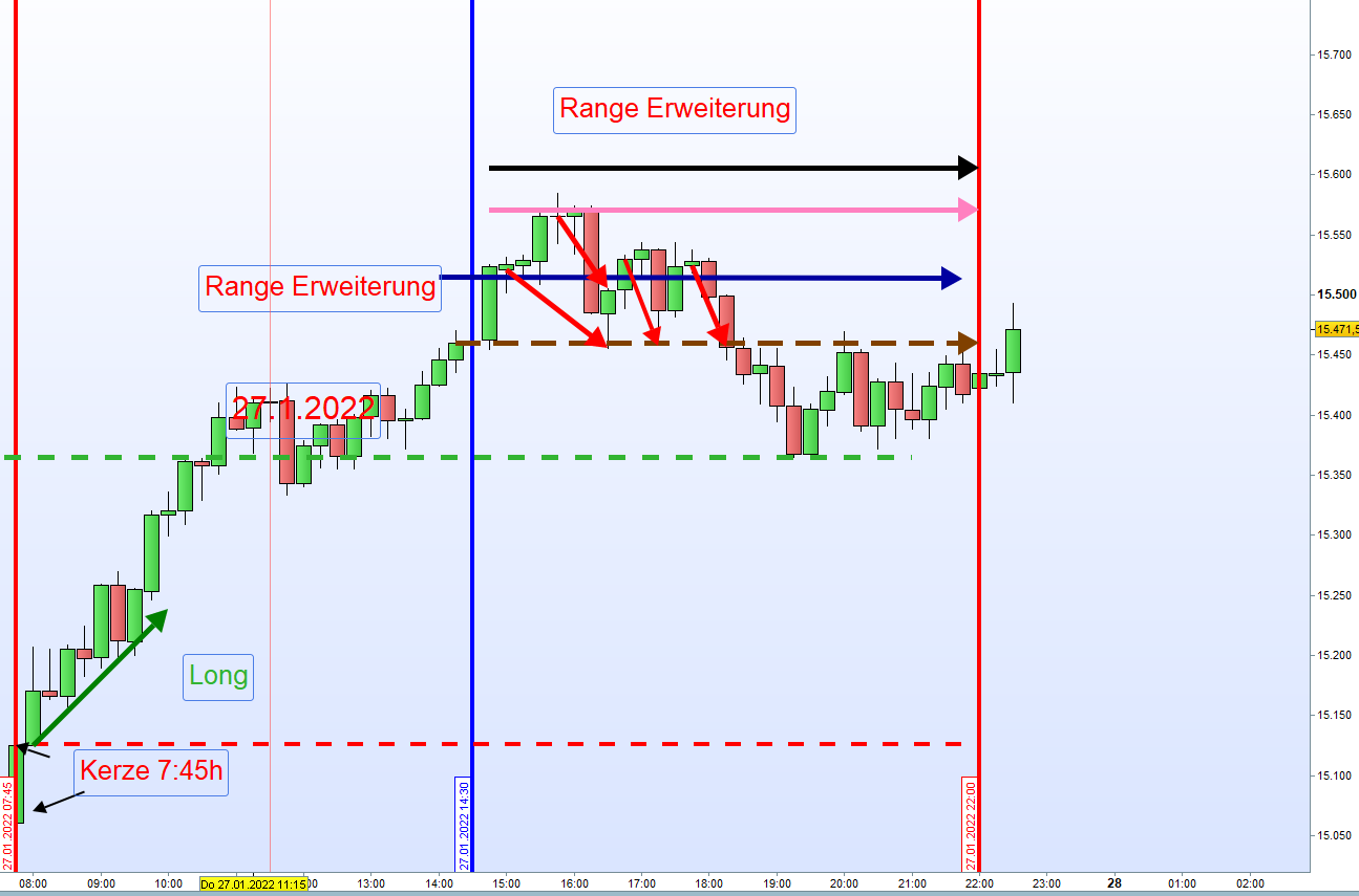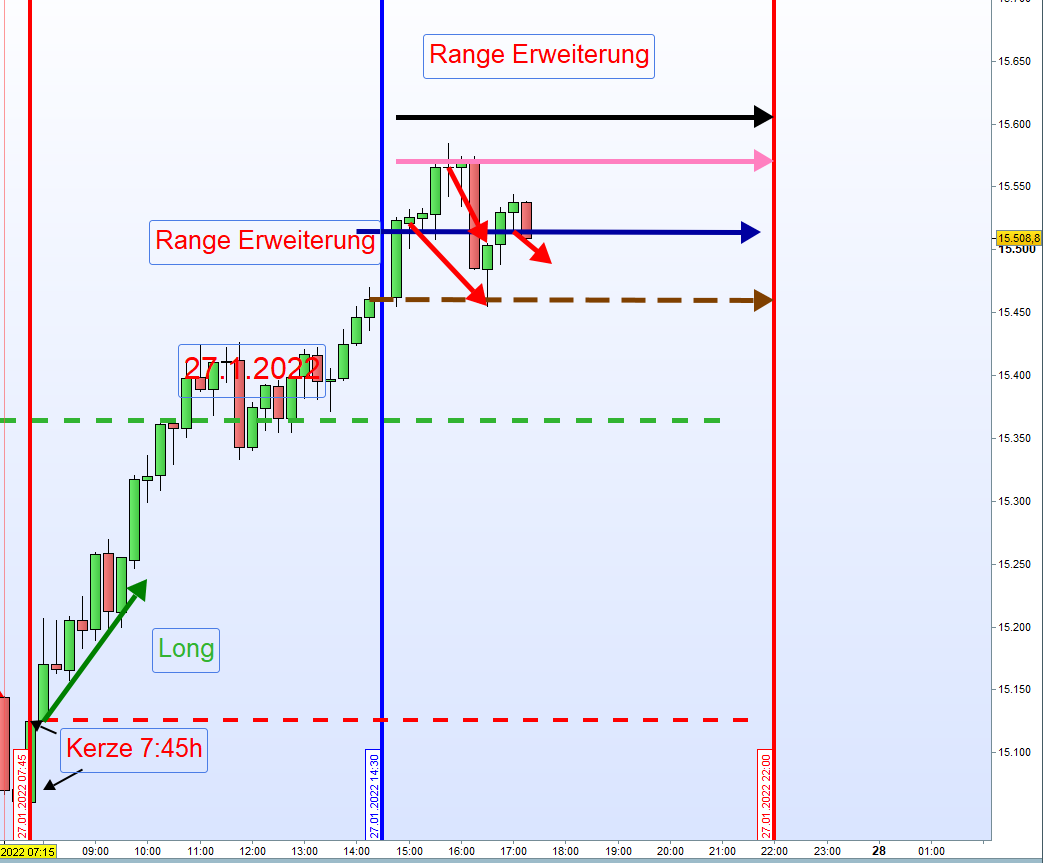 Ich hoffe die Range Erweiterung ist korrekt eingezeichnet, anhand der "Value Area" von 8:00h bis 14:30h und davon das High und Low ausgehend. -