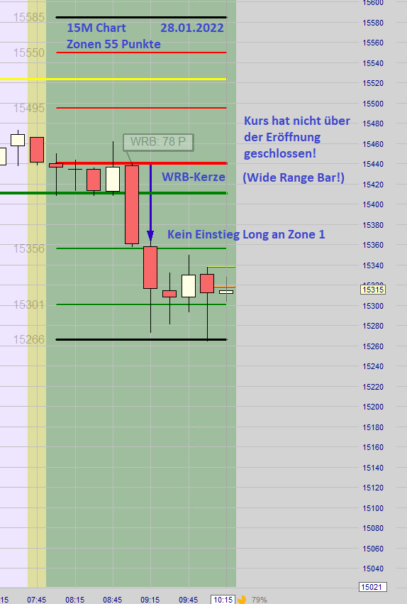 Unter gewissen charttechnischen Voraussetzungen kann in Richtung der Zonen gehandelt werden. Der Einstieg wird von der vollen Kerze beginnend um 7:45h bestimmt.
