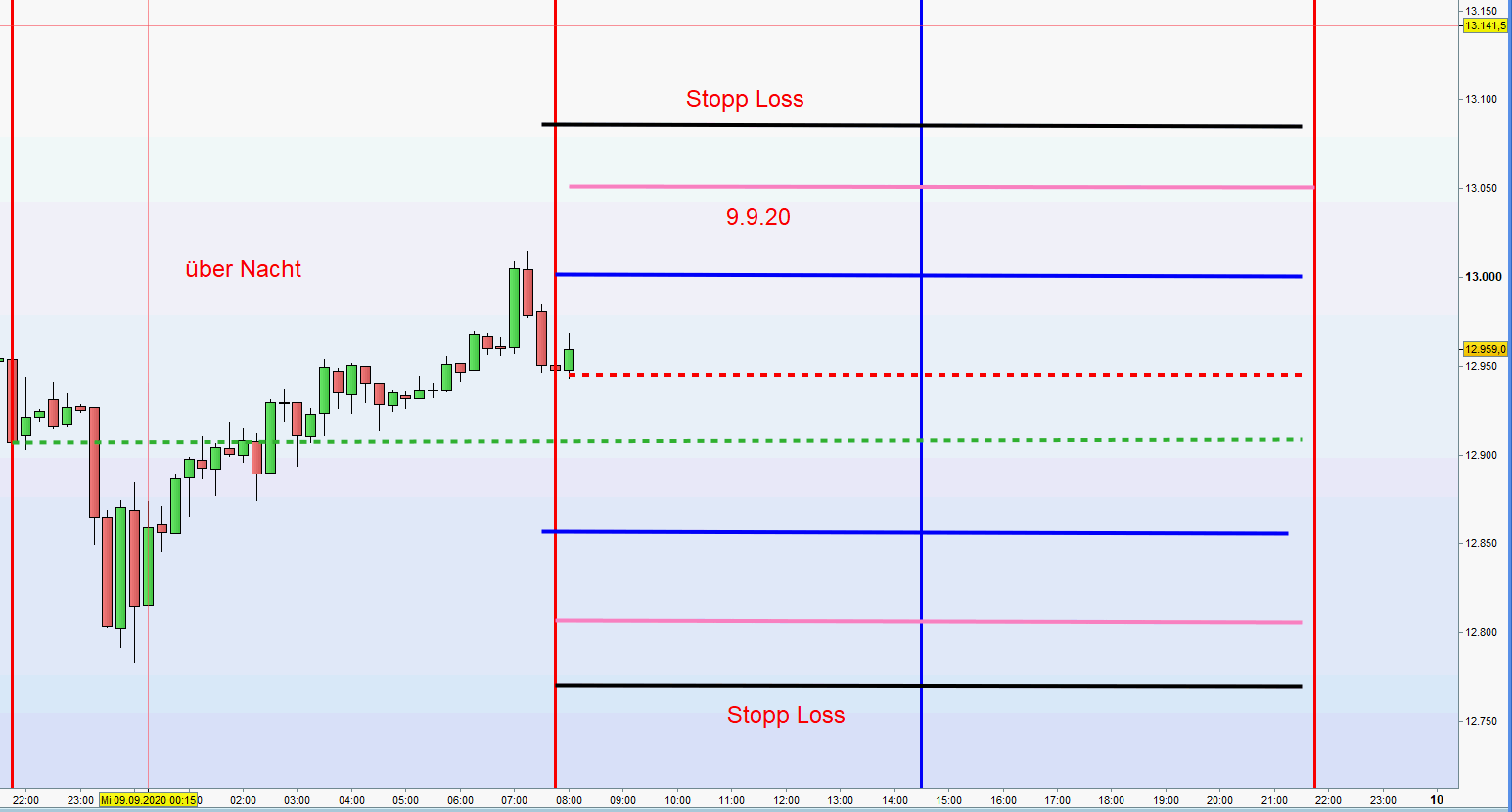 Grundsätzlich werden bis 13:45h Long Positionen gehandelt. Der Einstieg unterliegt strengen Kriterien: Sofortiger Einstieg Long um 8:00h wenn DOW Futures und FDAX positiv notieren oder auch steigender Kurs über dem Close vom DAX (XETRA) um 17:30h Vortag. Sind diese Voraussetzungen nicht gegeben, dann zuerst Eröffnung der Börse um 9:00h und Long Umkehrkerze abwarten. Dieser Einstieg ist dann die erste Zone Long. Teilgewinne (TP) zum Beispiel mit 30-50 Punkten, je nach Volatilität, können auch realisiert werden. Bei Rücksetzer kann Aufstockung erfolgen. An zweiter Zone Long Verdopplung der Position.