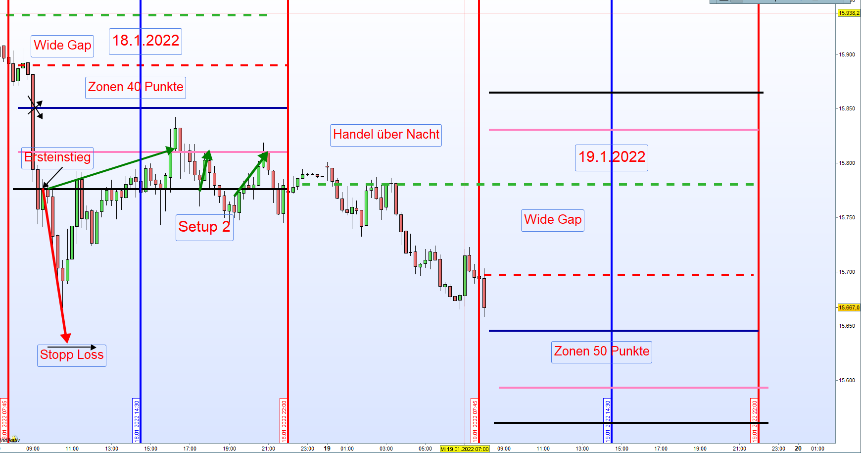 Aber hier im letzten Chart ist ein Wide Gap bzw. eine Zone und Stopp Loss eingezeichnet, weil Zone 1 gleich Zone 2 ist (Zone2+Stopp Loss) und dann hätte man auch, weil der Kurs zur 2. Zone zurückkam am Nachmittag gegen 16:00 Uhr das Setup 2 handeln können, aber nach 17 Uhr?