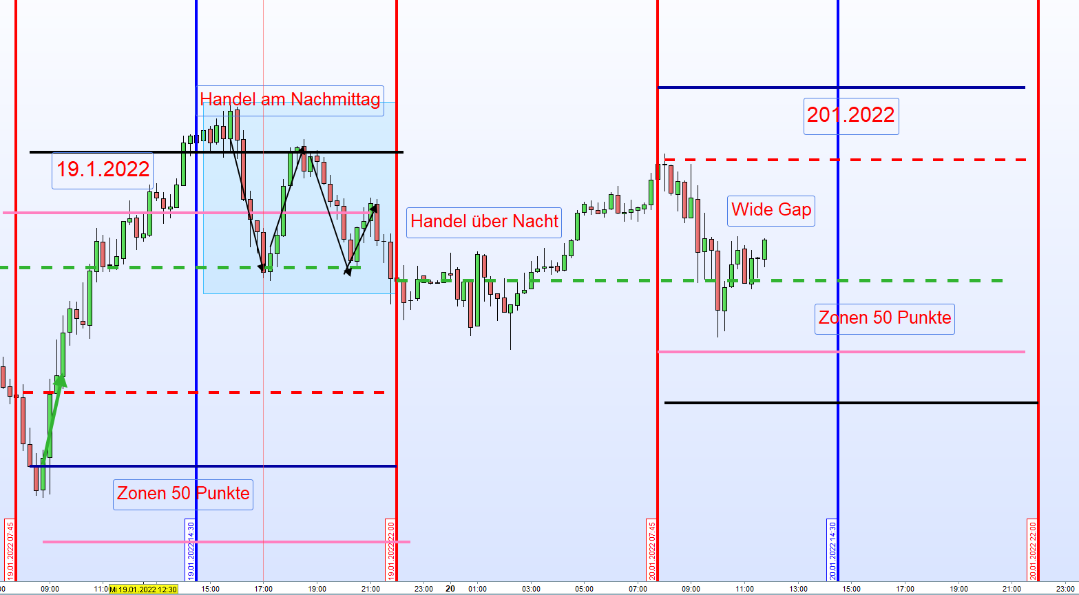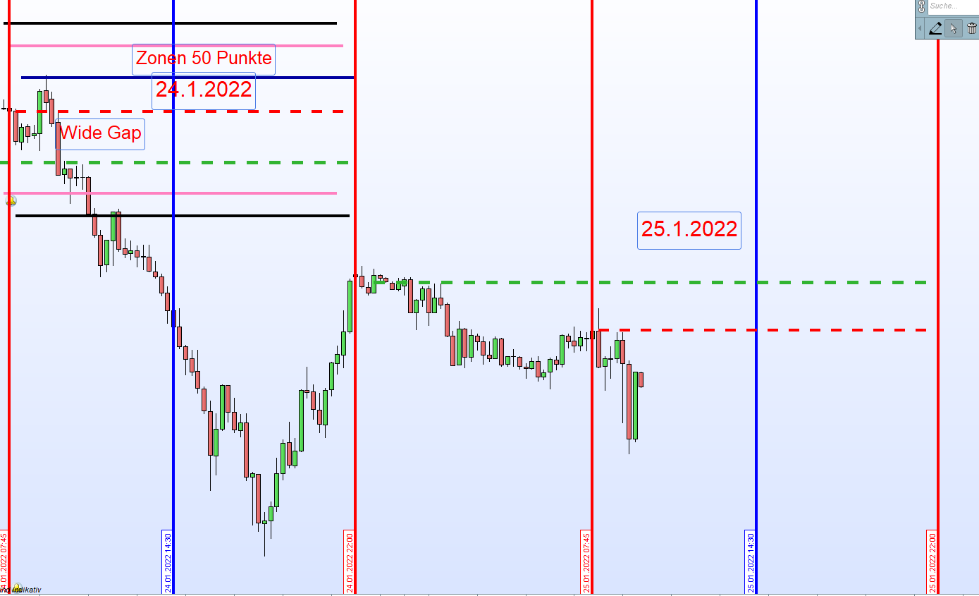 Wenn VDAX zwischen 25-30, dann 55 Punkte beidseitig. Weiterhin ist aufgrund der erhöhten Notierungen von DAX und DOW zu beobachten, dass bei einer Notierung dieser Indizes von minus 0,5% + morgens um 8;00h mit stark fallenden Kursen zu rechnen ist. Liegt diese Notierung vor de.investing.com/indices/indices-cfds dann erfolgt ein Einstieg Long erst an der zweiten Zone bzw. darunter. Falls Unsicherheit besteht, wird auf den Handel verzichtet.