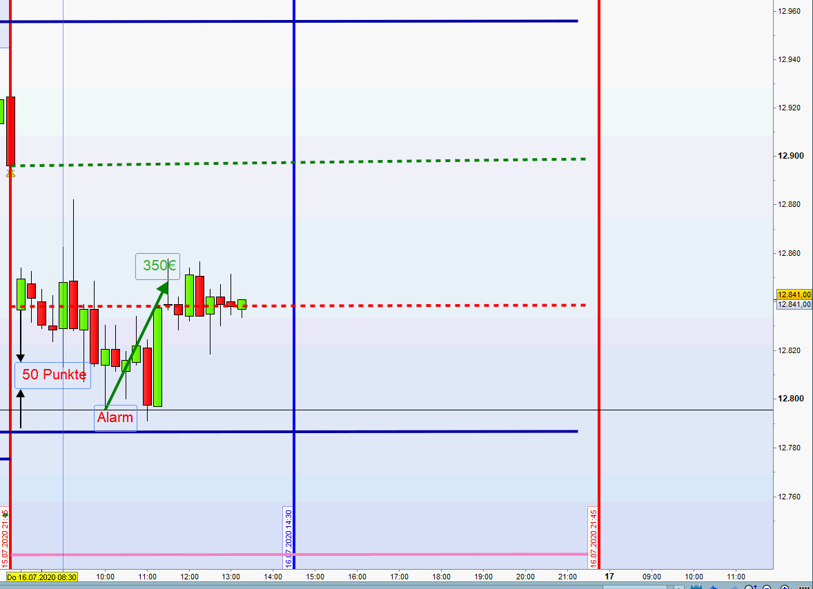 Wenn ich vom Open ( 12846 Xetra ) 60 Punkte nach unten gehe, komme ich bei 12786 an, die erste long Zone also.