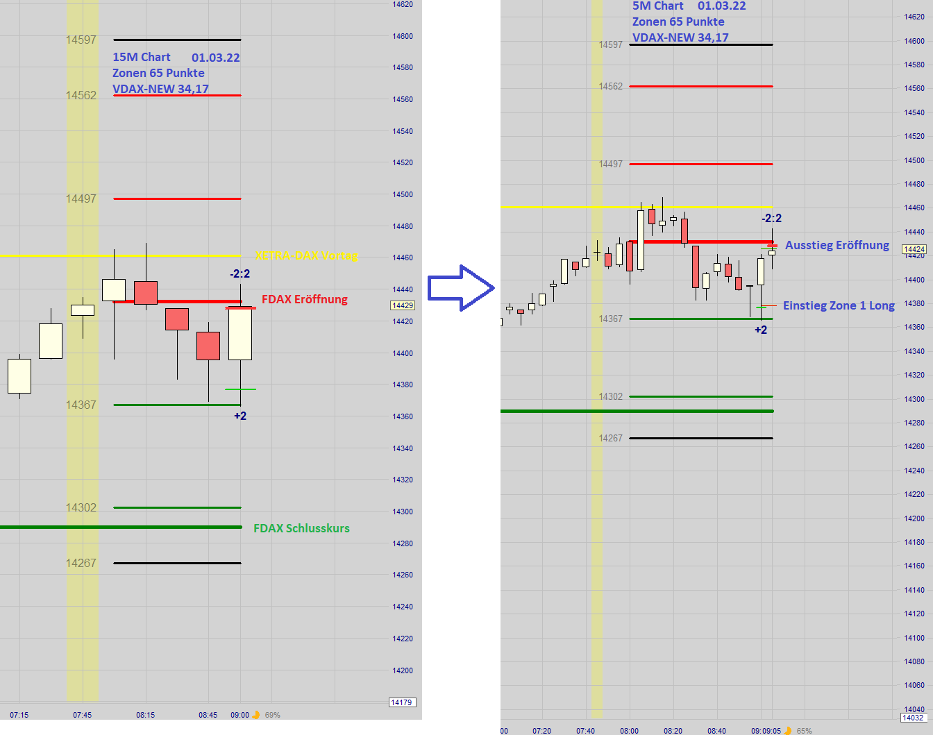 Heute war ein VDAX-NEW von 39,04 um 8:00h, deswegen werden die Zonen wie folgt eingezeichnet direkt über/unter der Eröffnung: