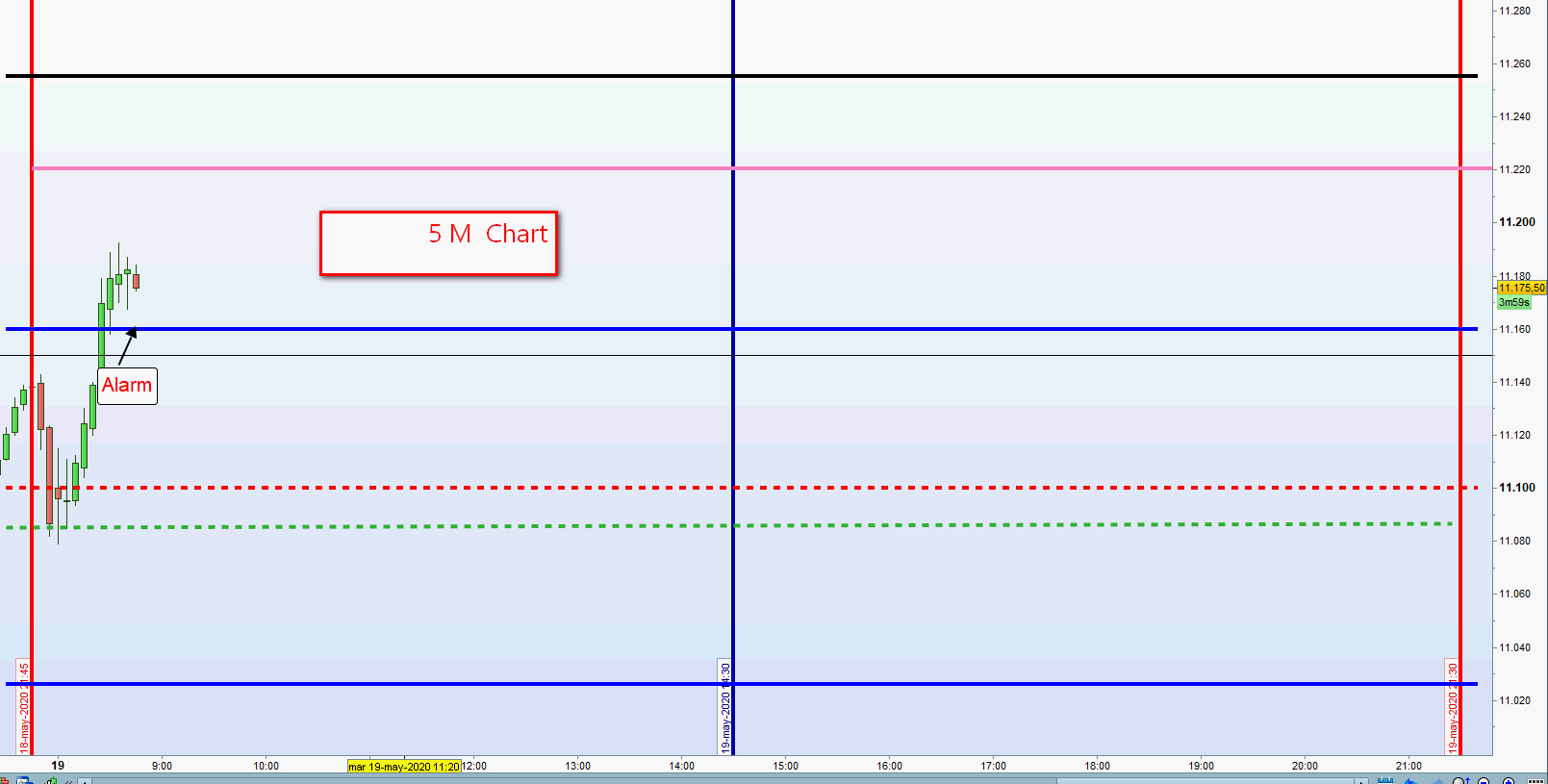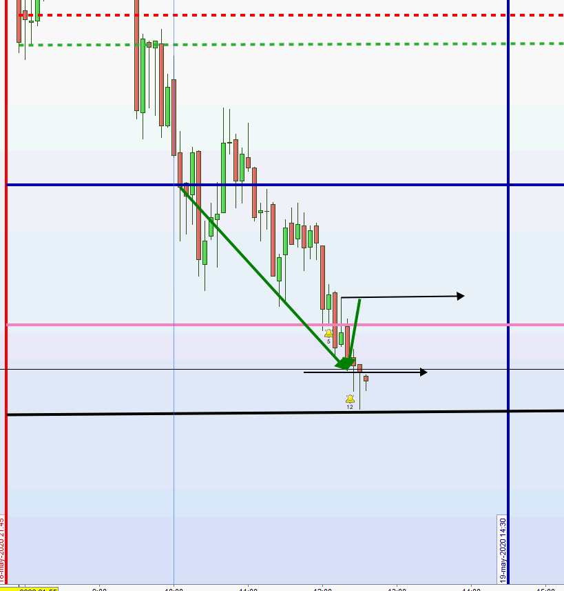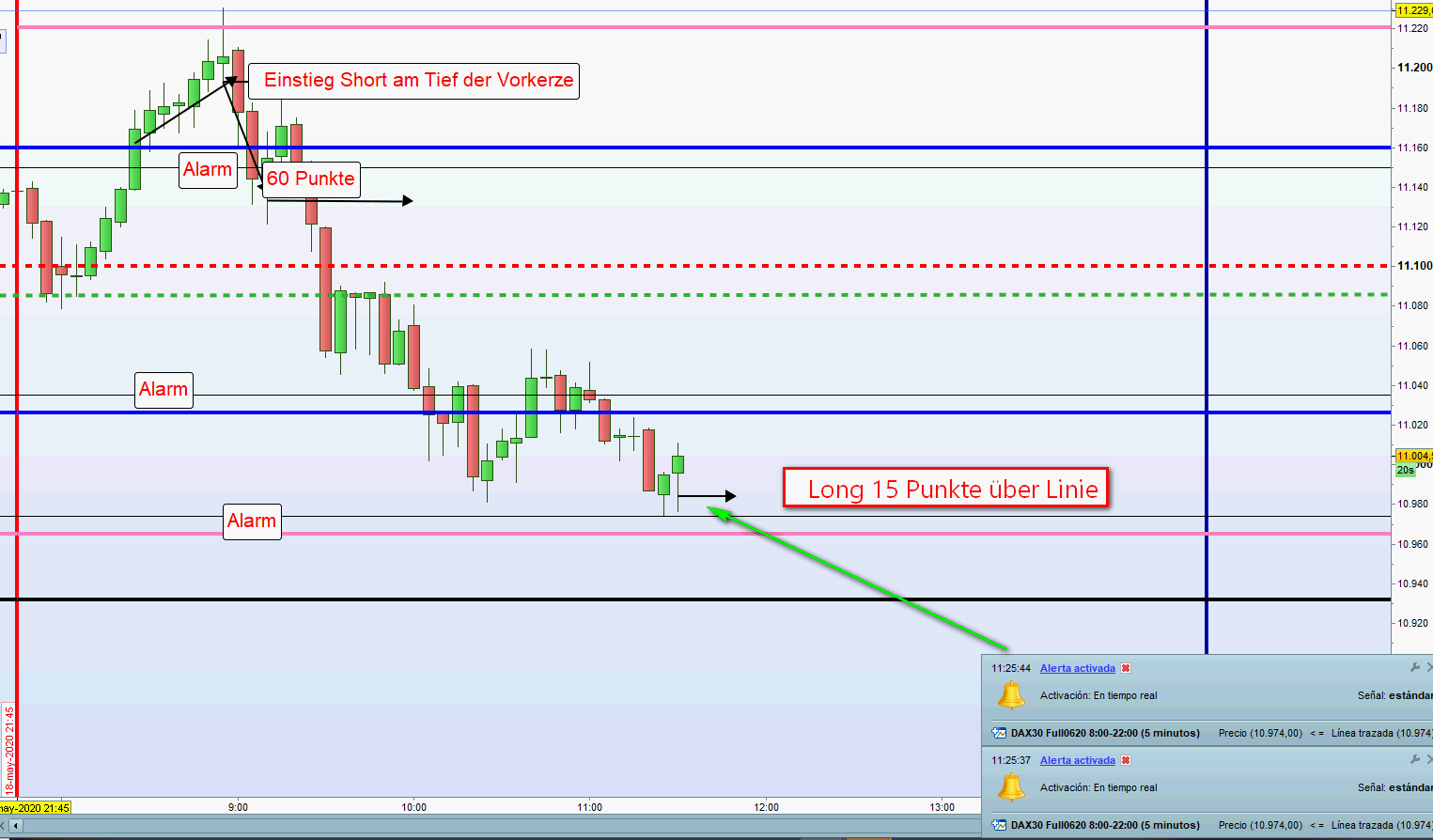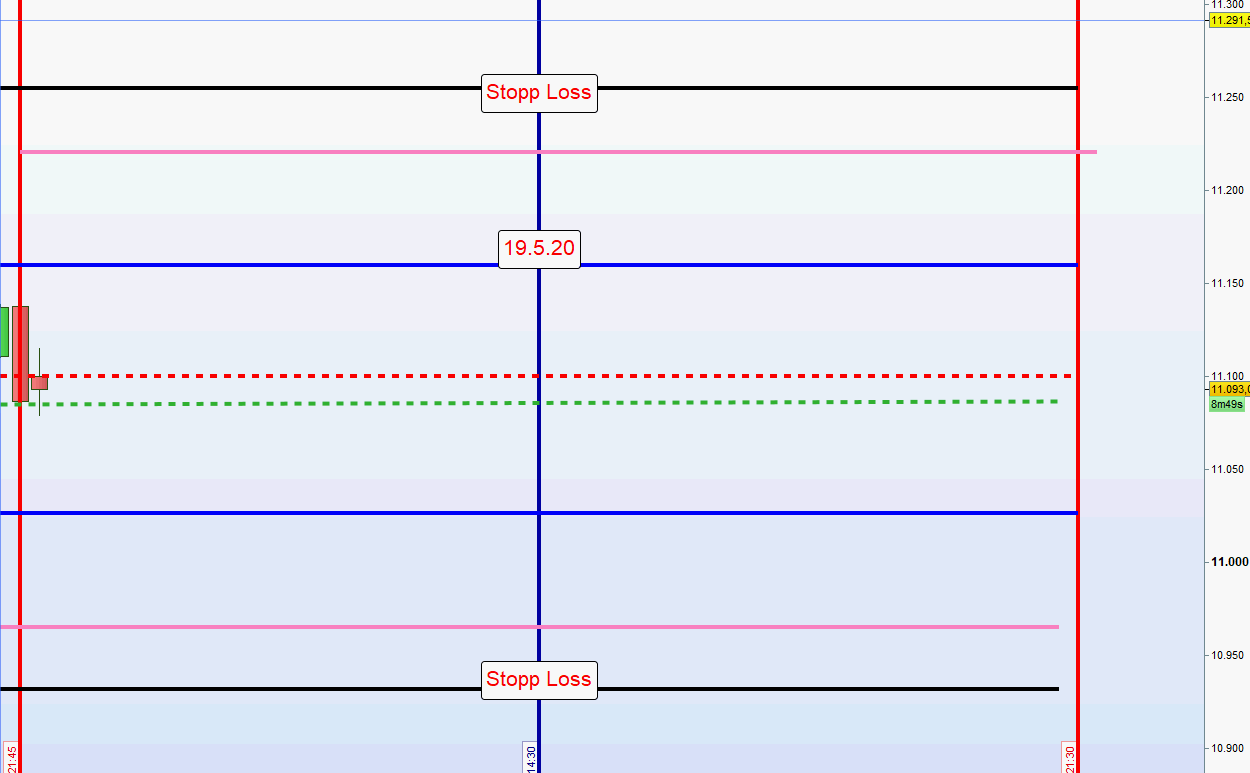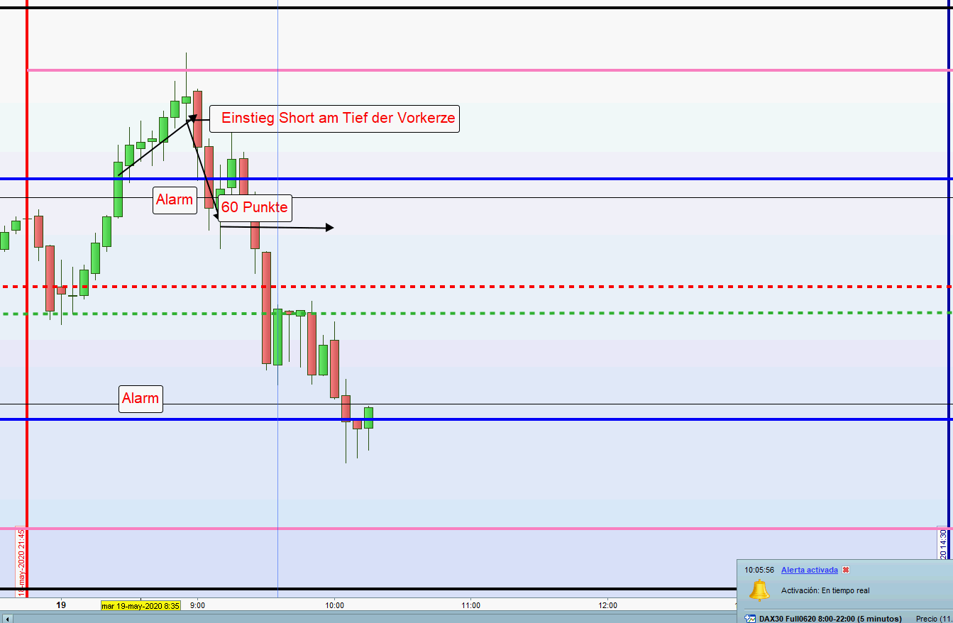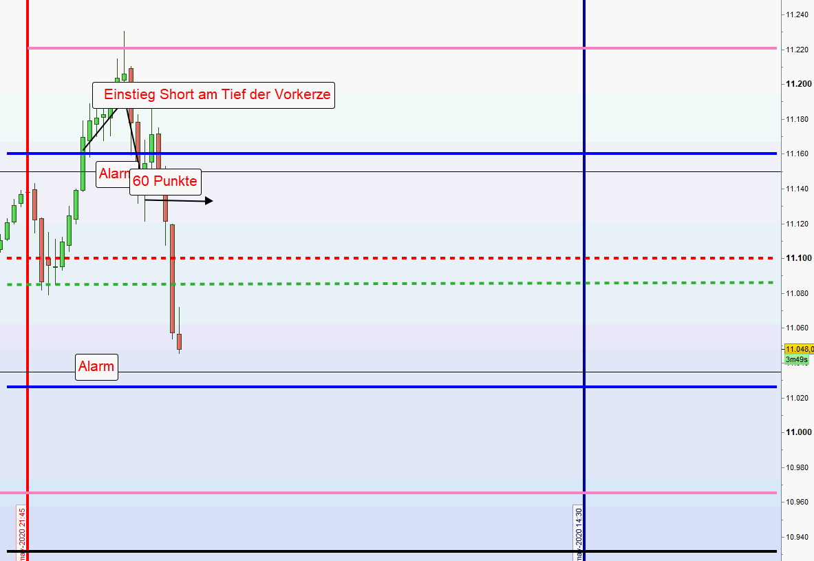 Bei 60 Punkte Zone Alarm 10 Punkte darunter und in Stellung halten Order 15 Punkte. Alles unter der Linie. Wird der Kurs über die Linie gehandelt, dann Anpassung der Order bis zur Linie abgesetzt. Kommt es zu keinem Einstieg, dann nächste 5M Umkerhrkerze abwarten. Diese kann auch an der zweiten Zone sein. -