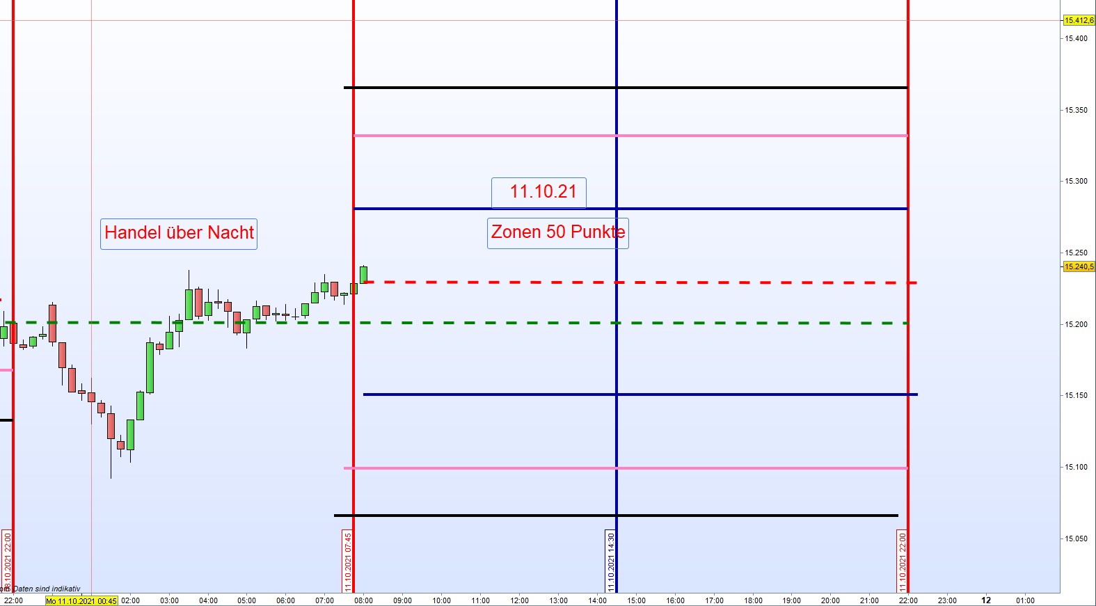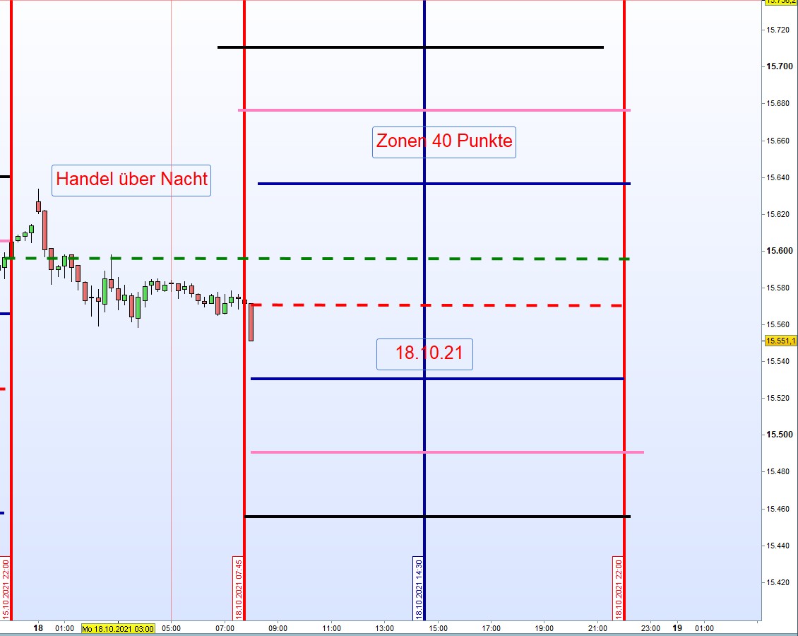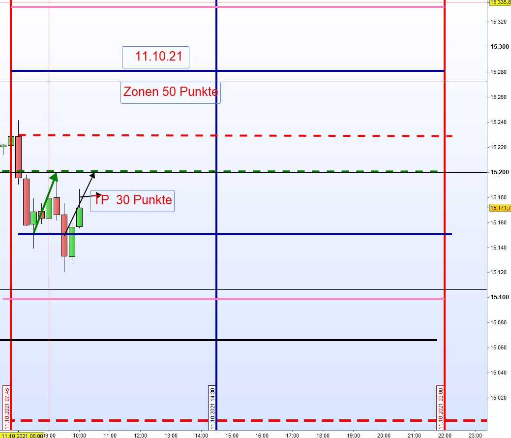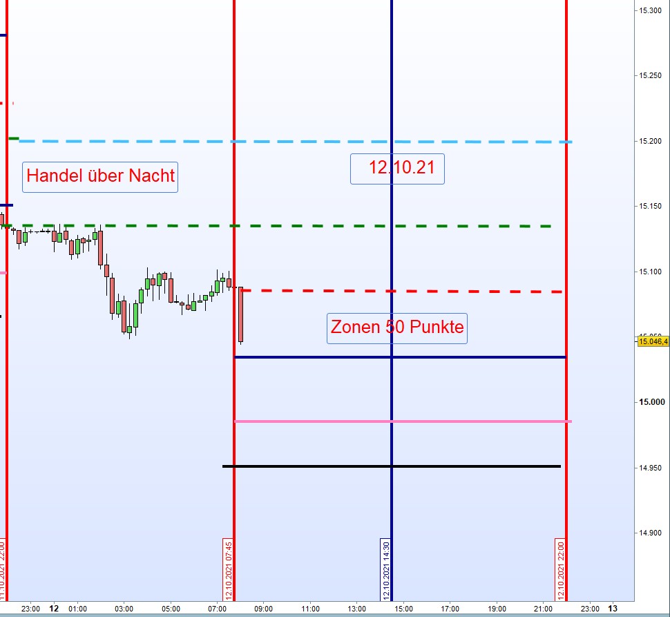 Weiterhin ist aufgrund der erhöhten Notierungen von DAX und DOW zu beobachten, dass bei einer Notierung dieser Indizes von minus 0,5% + morgens um 8;00h mit stark fallenden Kursen zu rechnen ist. Liegt diese Notierung vor dann erfolgt ein Einstieg Long erst an der zweiten Zone bzw. darunter. Falls Unsicherheit besteht, wird auf den Handel verzichtet.