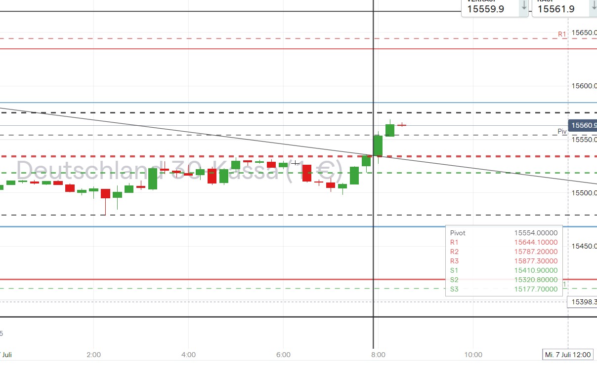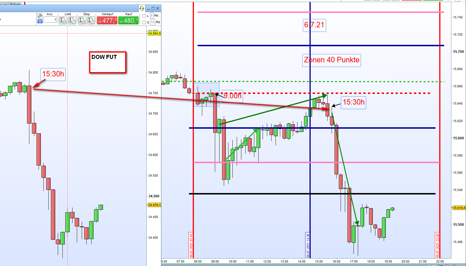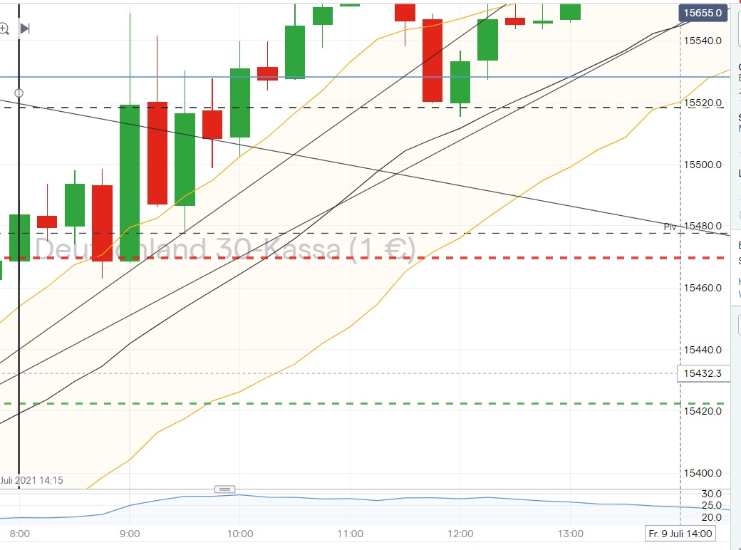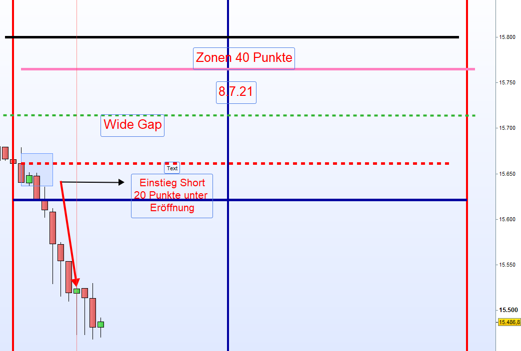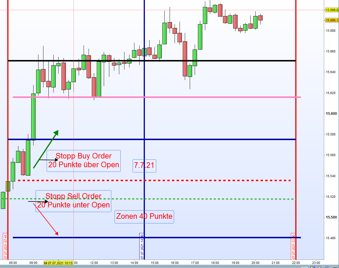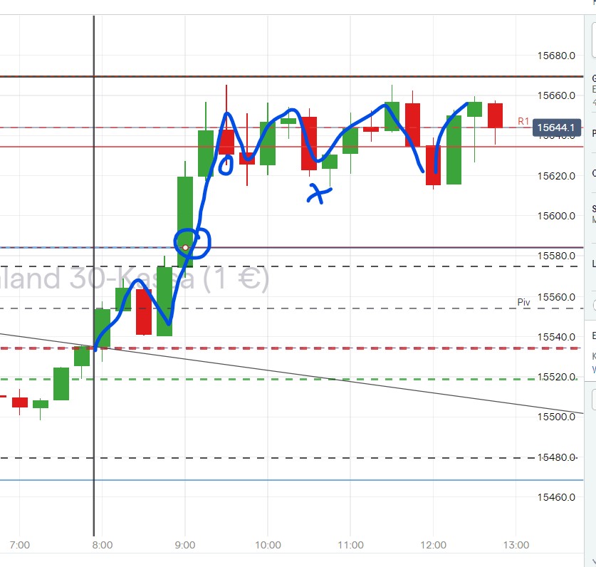 Heute wiederum kein Close über Eröffnung. Am besten immer die ersten zwei Kerzen abwarten bevor Limit Order gesetzt werden. Einmal eröffnet, kannst Du auch die Order auf der anderen Seite auf den Eröffnungskurs setzen und dann trailing stop