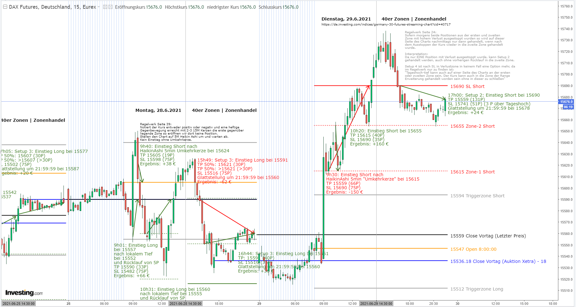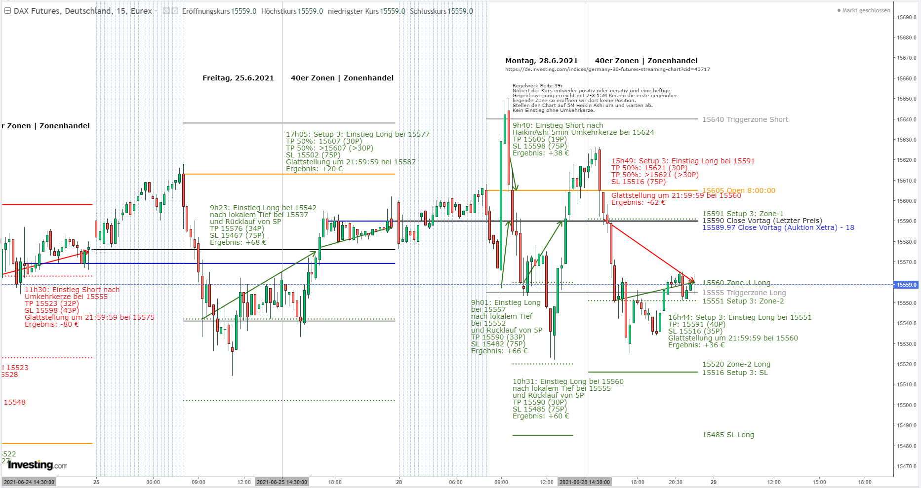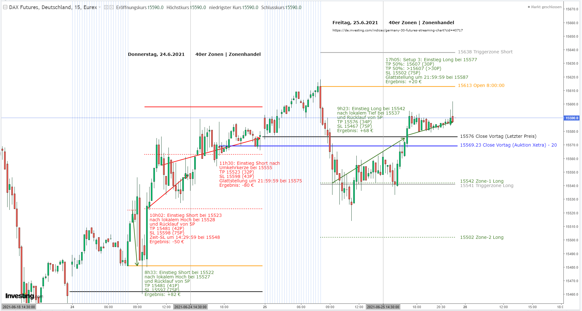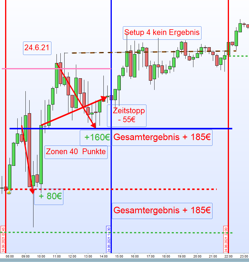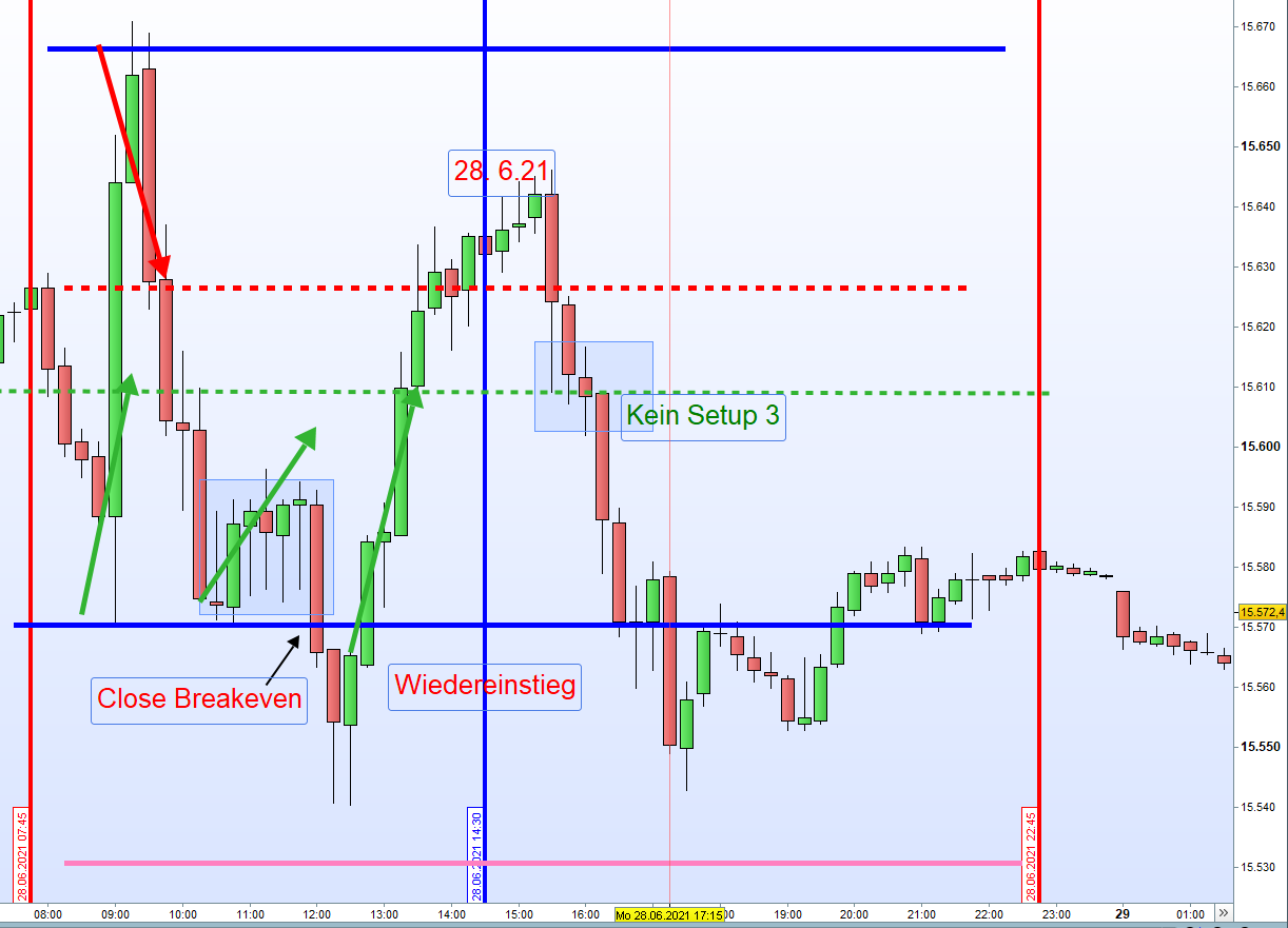 Sollte der Kurs von oben durch den Close vom Vortag gehandelt werden, dann muss diese Kerze eindeutig mit grün, also über dem Close abschließen, um einen Setup 3 zu rechtfertigen. Sollte dies in der Vergangenheit nicht der Fall gewesen sein, dann war der Einstieg nicht korrekt.