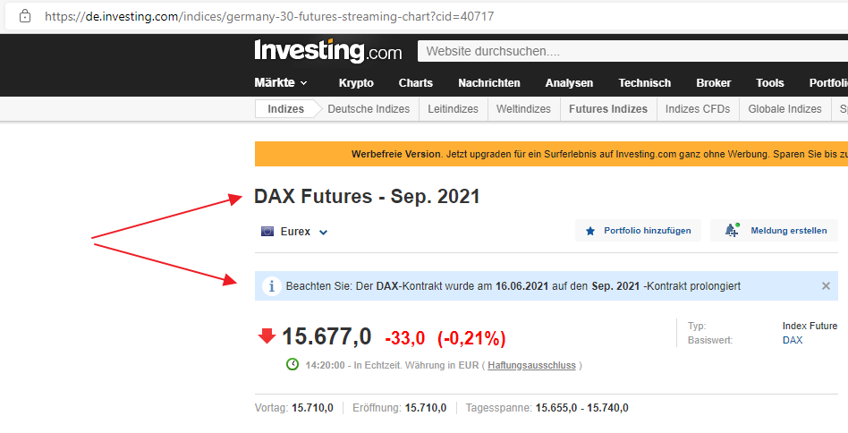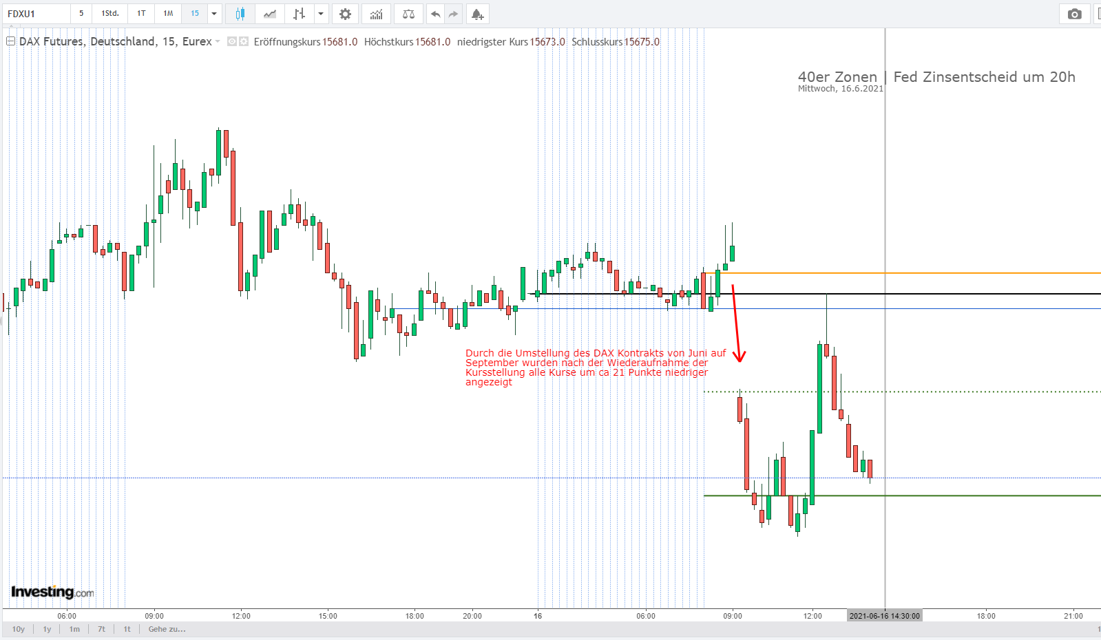 Das Ergebnis des Beitrags von heute morgen 11h45 war falsch, da Investing.com die Kursstellung im Verlauf des Vormittags geändert hatte ("Der DAX-Kontrakt wurde am 16.06.2021 auf den Sep. 2021 Kontrakt prolongiert")