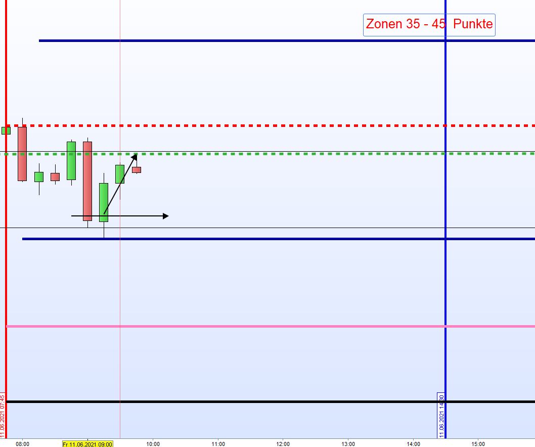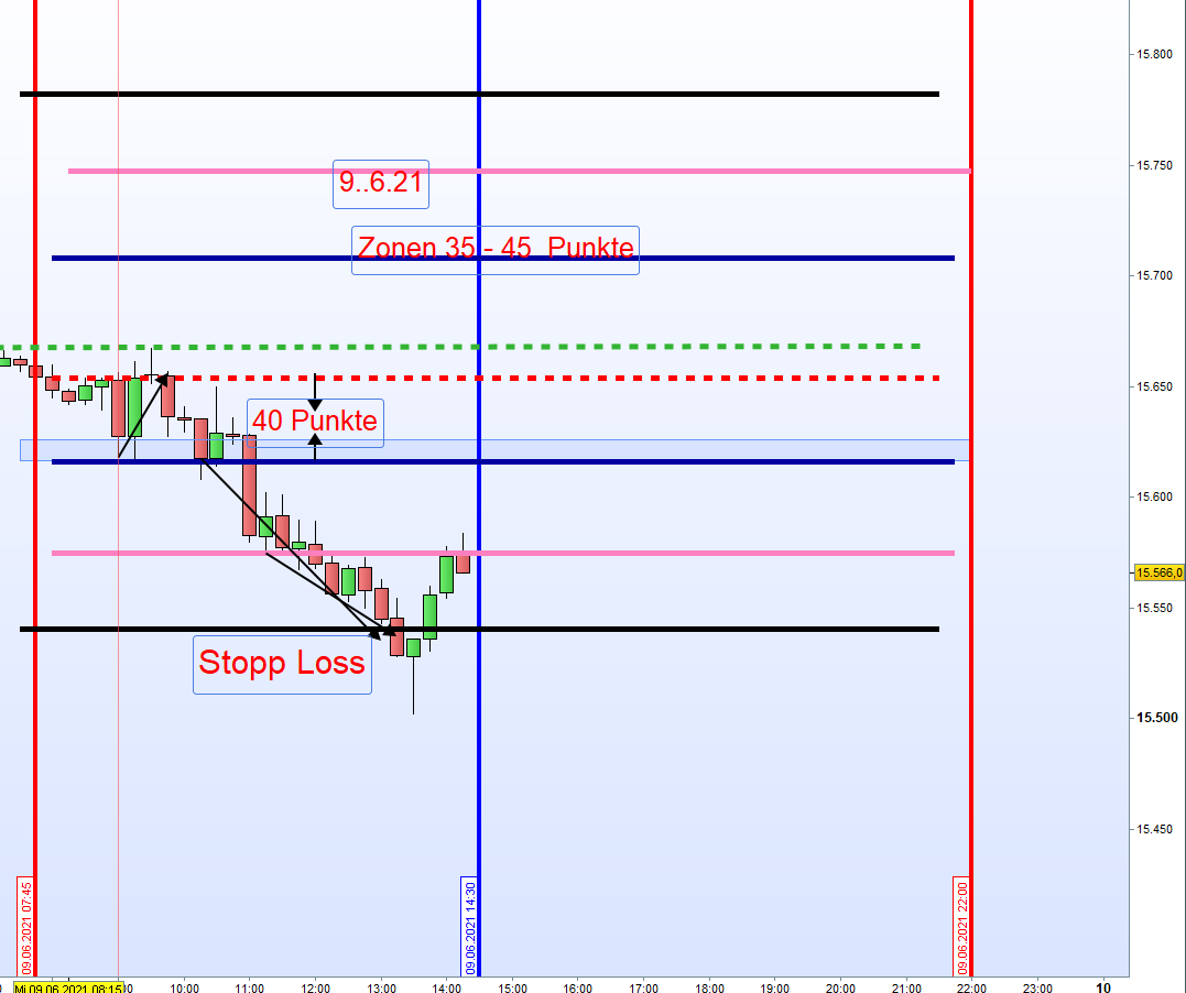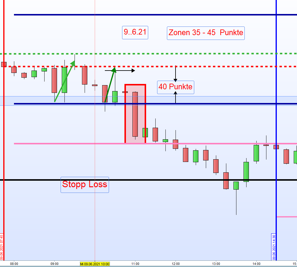 Im Prinzip gleich mache ich das auch bei einem Alarmeinstieg, wenn das TP nur knapp (z.B. um 5 Punkte) verfehlt wurde. Wenn ich dann tatsächlich auf Einstand ausgestoppt werde, dann versuche ich einen besseren Wiedereinstieg (als der vorherige Alarmeinstieg). Falls das nicht klappt, dann habe ich ja immerhin nichts verloren.