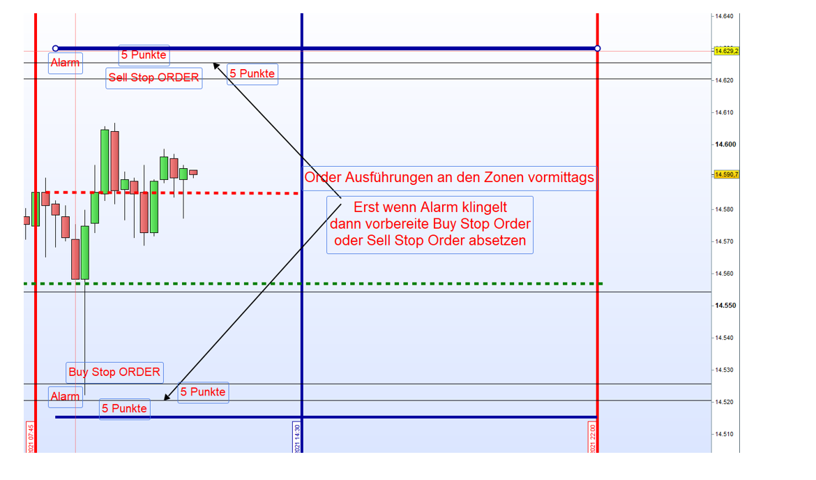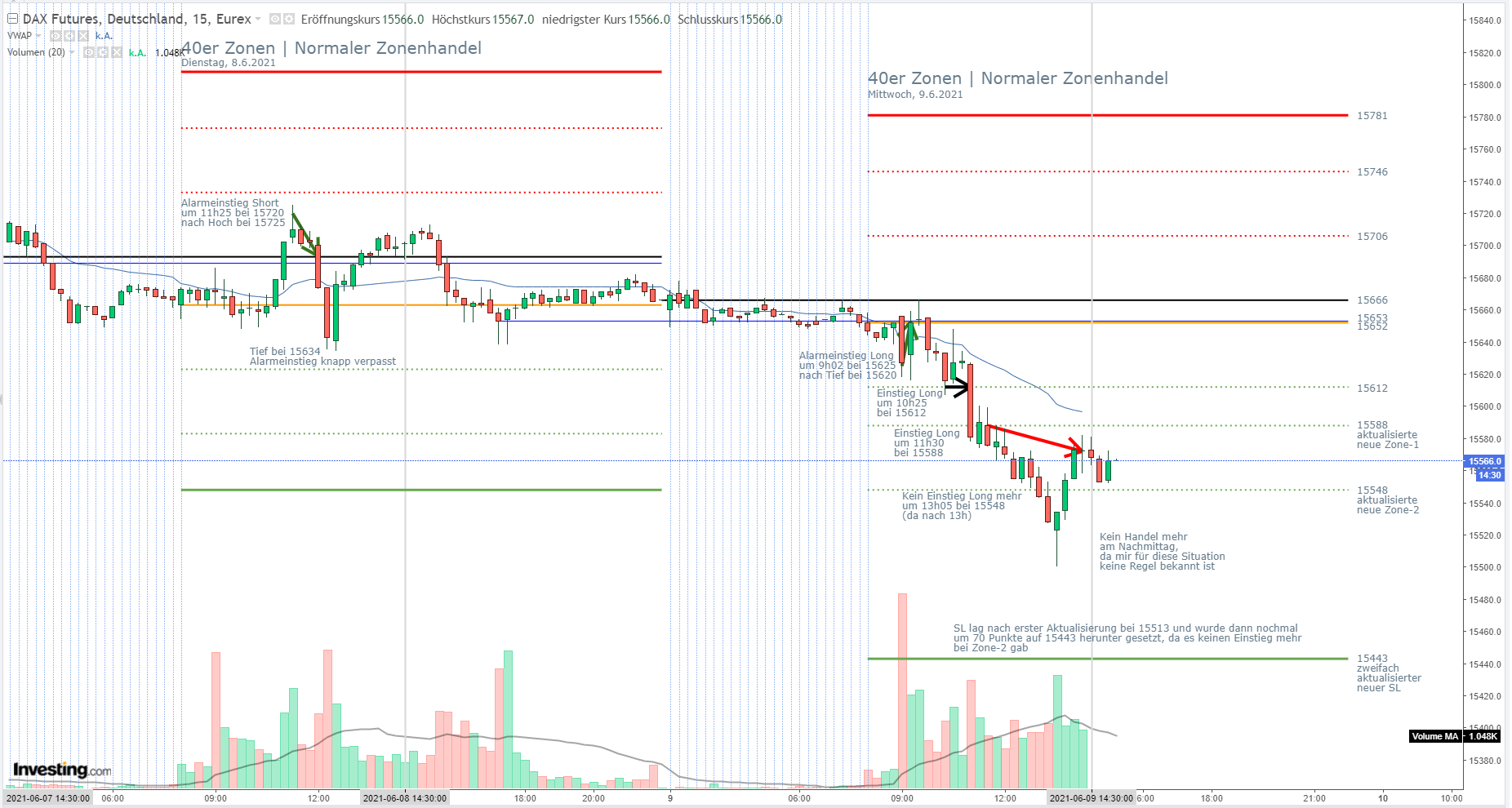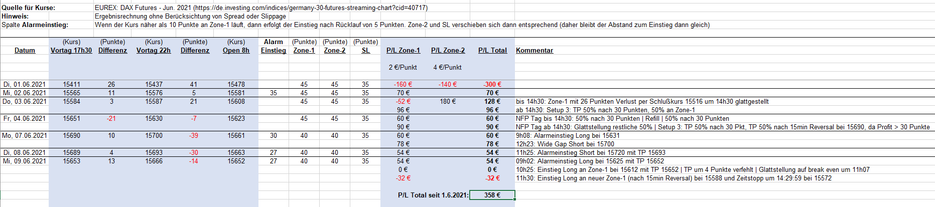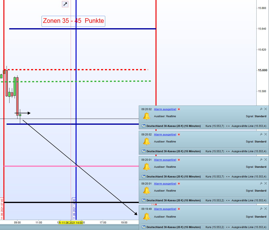 Im Prinzip gleich mache ich das auch bei einem Alarmeinstieg, wenn das TP nur knapp (z.B. um 5 Punkte) verfehlt wurde. Wenn ich dann tatsächlich auf Einstand ausgestoppt werde, dann versuche ich einen besseren Wiedereinstieg (als der vorherige Alarmeinstieg). Falls das nicht klappt, dann habe ich ja immerhin nichts verloren.