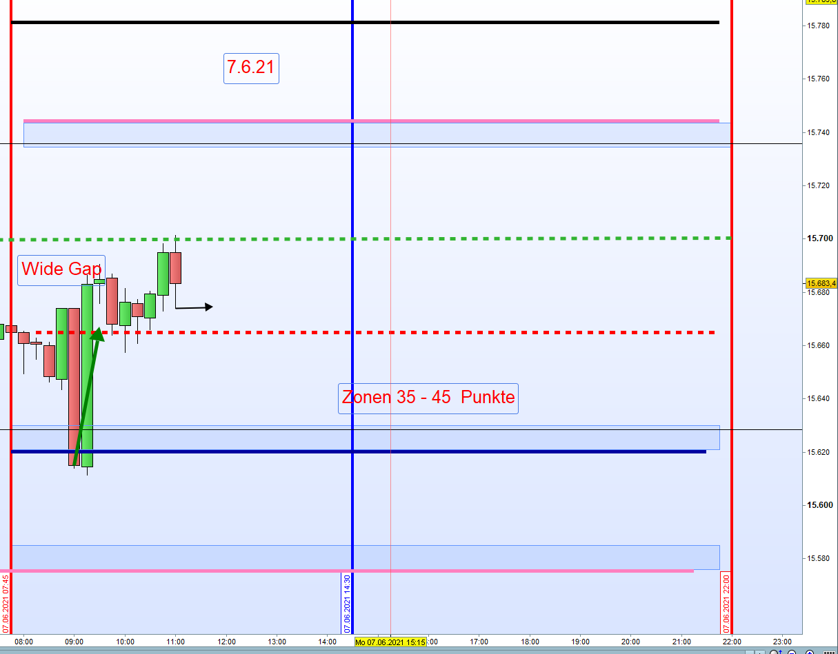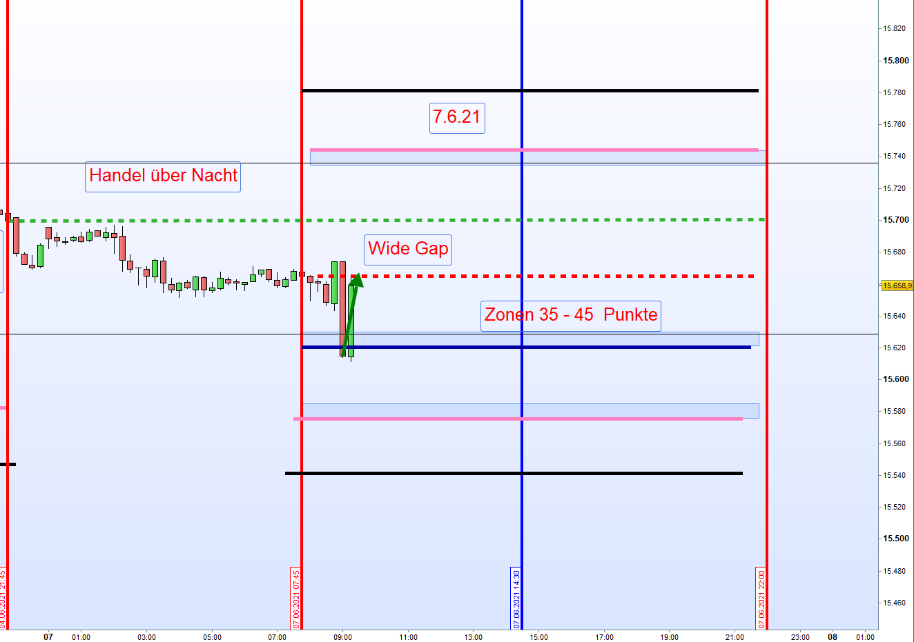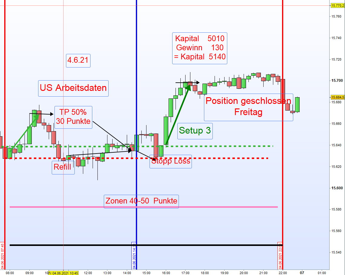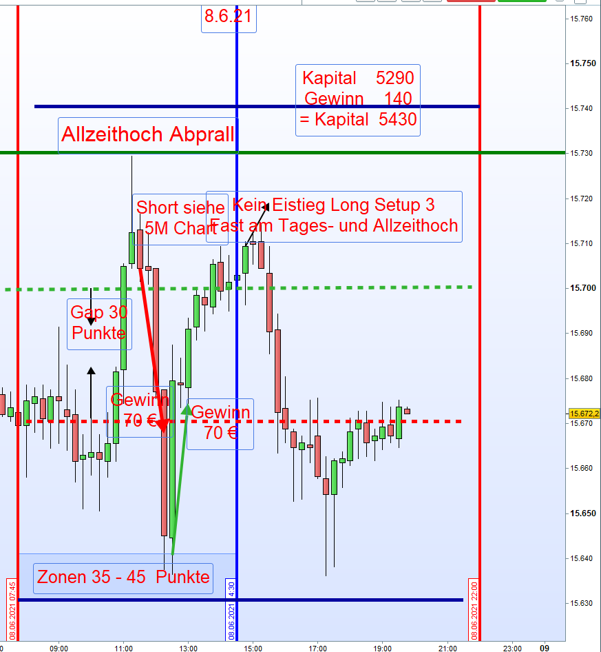Am Nachmittag handelte der Kurs kurz über dem Setup 3. Eröffnung long keine gute Option da Setup 3 fast am Tages-und Allzeithoch. Siehe auch Chart im Regelwerk.