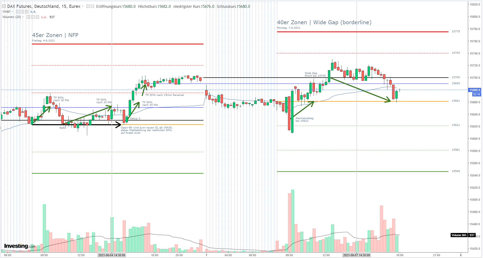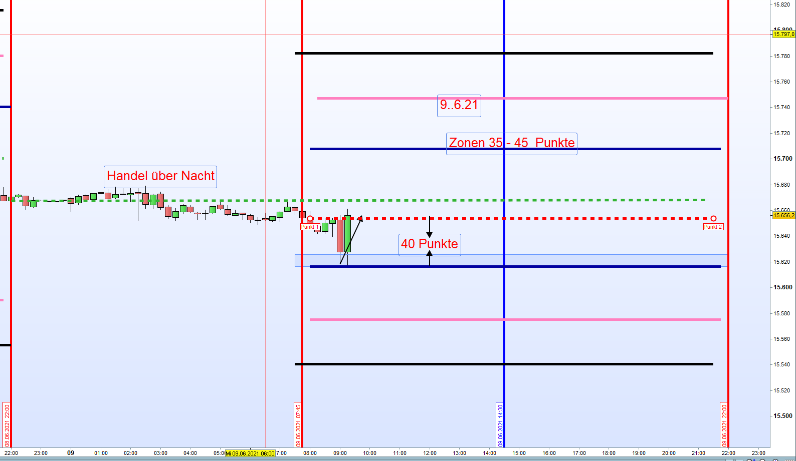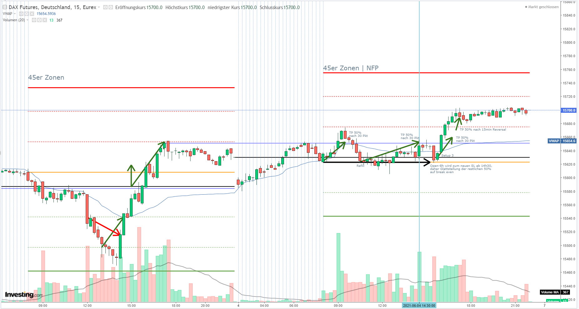 Am Nachmittag handelte der Kurs kurz über dem Setup 3. Eröffnung long keine gute Option da Setup 3 fast am Tages-und Allzeithoch. Siehe auch Chart im Regelwerk.