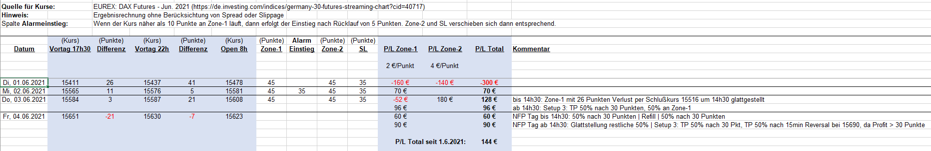 Aktualisierter Profit seit 1.6.2021: 144 EUR (mit 2 und 4 CFDs) -