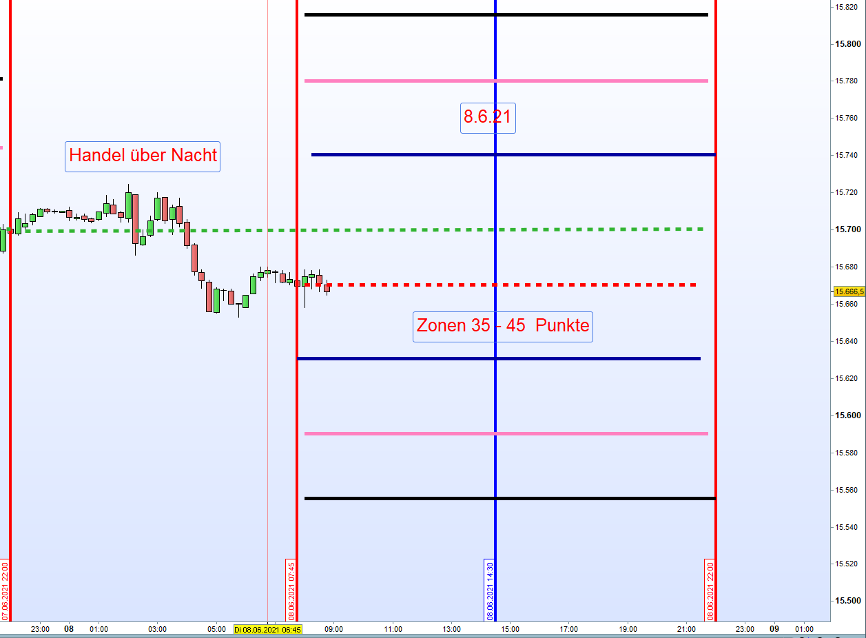 Das ist für den Anfang auch OK jedoch ist das tägliche Handelsgerüst mit den Zonen lediglich eine Komponente und der eigentliche Handel muss auch noch andere Parameter oder Vorgabengeber wie die DOW FUT, Nachrichten oder zur Zeit das DAX Allzeithoch berücksichtigen.