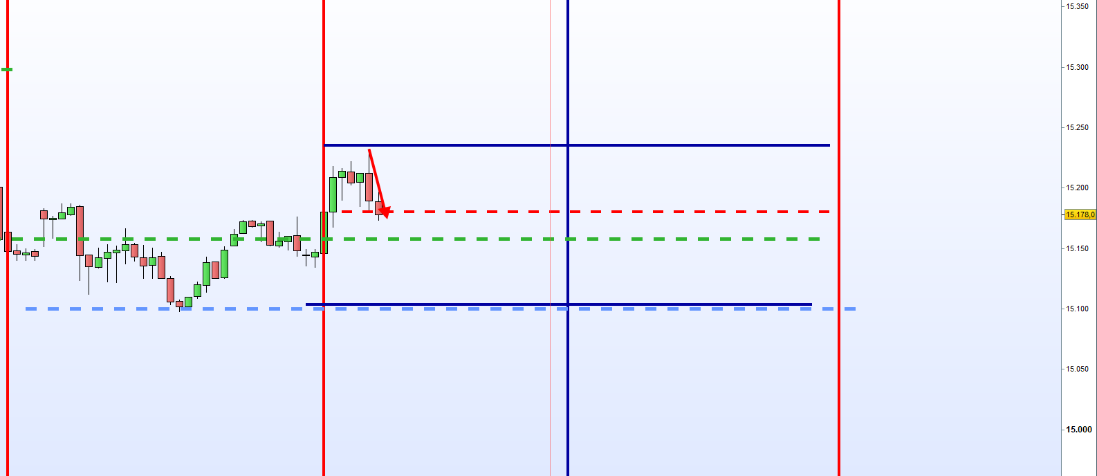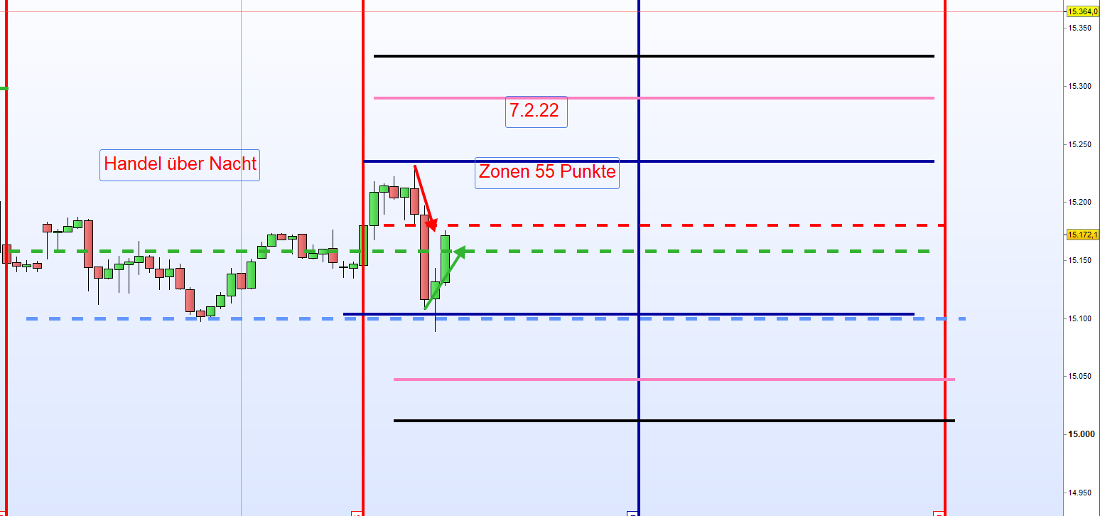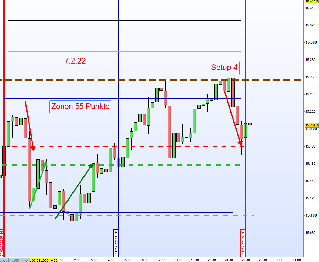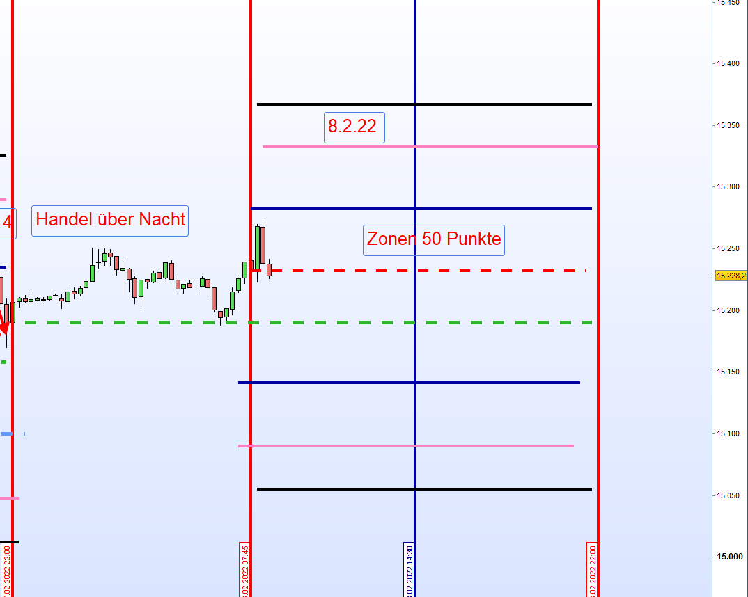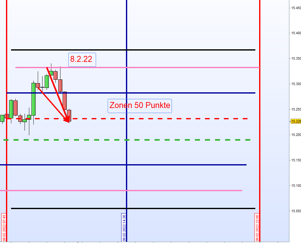 Wenn man sieht, das eine lange 15M Kerze direkt die erste Zone durchschneidet, wartet man ab und man könnte auch eine Zonenanpassung vornehmen und erst nach einer Umkehrkerze einsteigen und dann wäre der Einstieg höher und der Einstieg wäre Zone 1 (nur für den Trade).