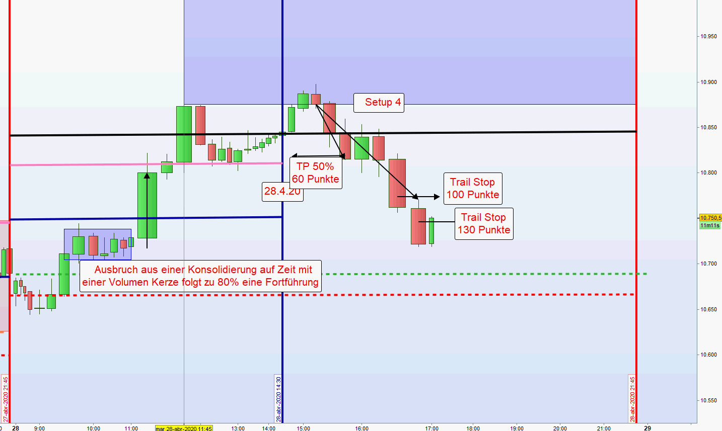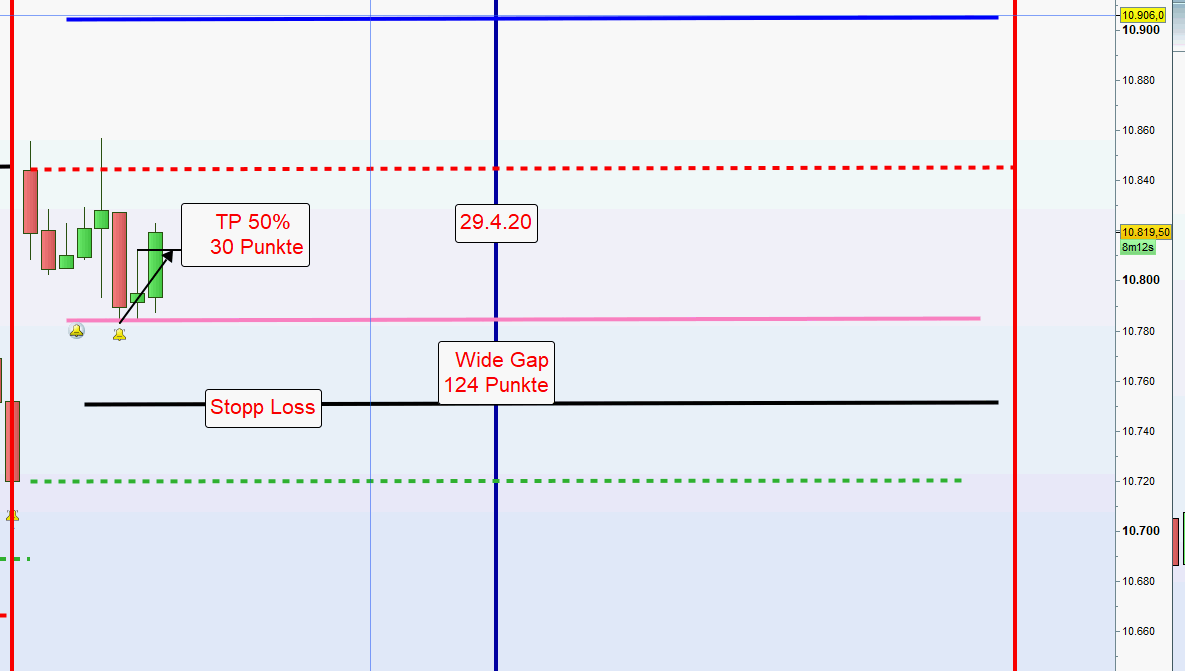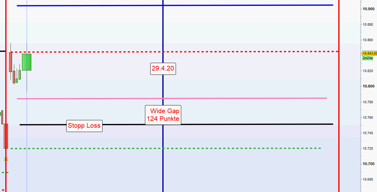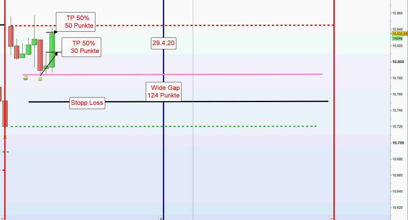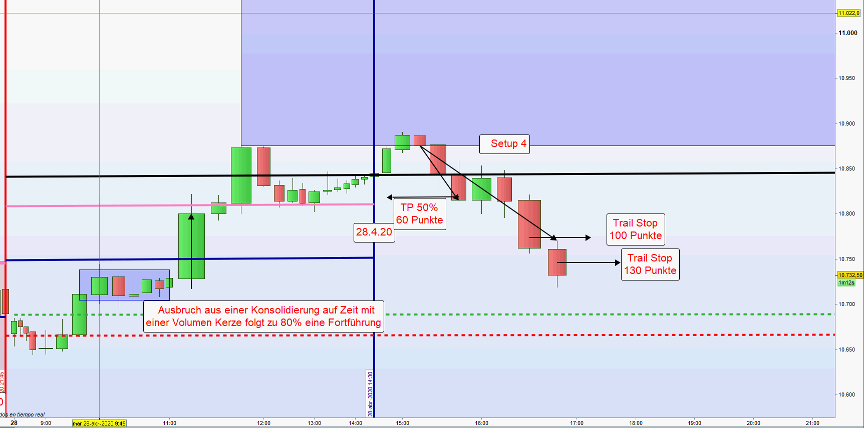 Betrachten wir den Chart. Nach einer Seitwärts-Konsolidierung mit Plus und Minus Kerzen (typisch) am oberen Ende der Range und nach einer Dauer von 90 Minuten kam es zu einem Ausbruch mit hohem Volumen. Nach einer derartigen Kerze erfolgt mit statistisch höchster Wahrscheinlichkeit eine Fortsetzung. Nachdem bereits eine Positionseröffnung mit 3 CFDs durch Limit Order an der ersten Zone erfolgte, warten wir an der zweiten Zone auf eine´Umkehrkerze oder Verzichten auf eine neue Eröffnung einer Position.