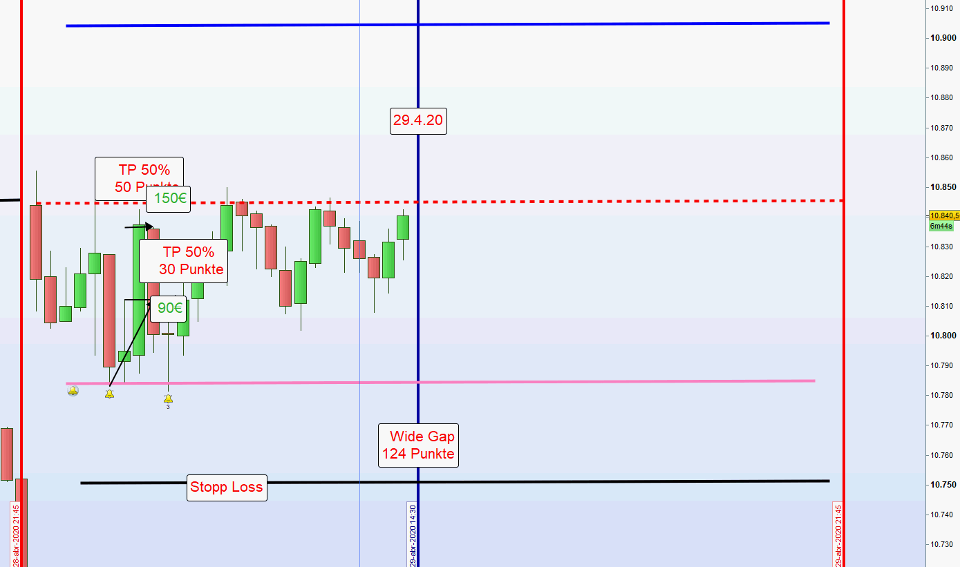 Wir erweitern den Stopp Loss für die 3CFDs auf 165 Punkte (Höchstverlust 495€ : durch 3). Dieser neue Stopp Loss wurde vormittags nicht ausgelöst. Am Nachmittag wird eine weitere Position von 3 CFDs eröffnet und gemäß dem Chartbild gemanagt. Spätestens zum Einstiegspreis der an der ersten Zone eröffneten Position wird alles mit einem Gewinn glatt gestellt.