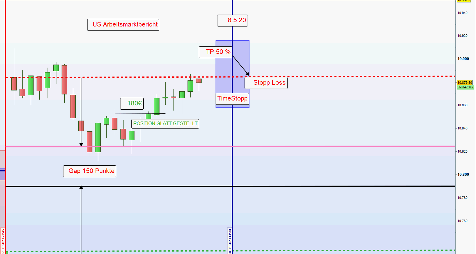 Eröffnungskurs. Läuft die Restposition weiter in den Gewinn dann Glattstellung nach einer Umkehrkerze.