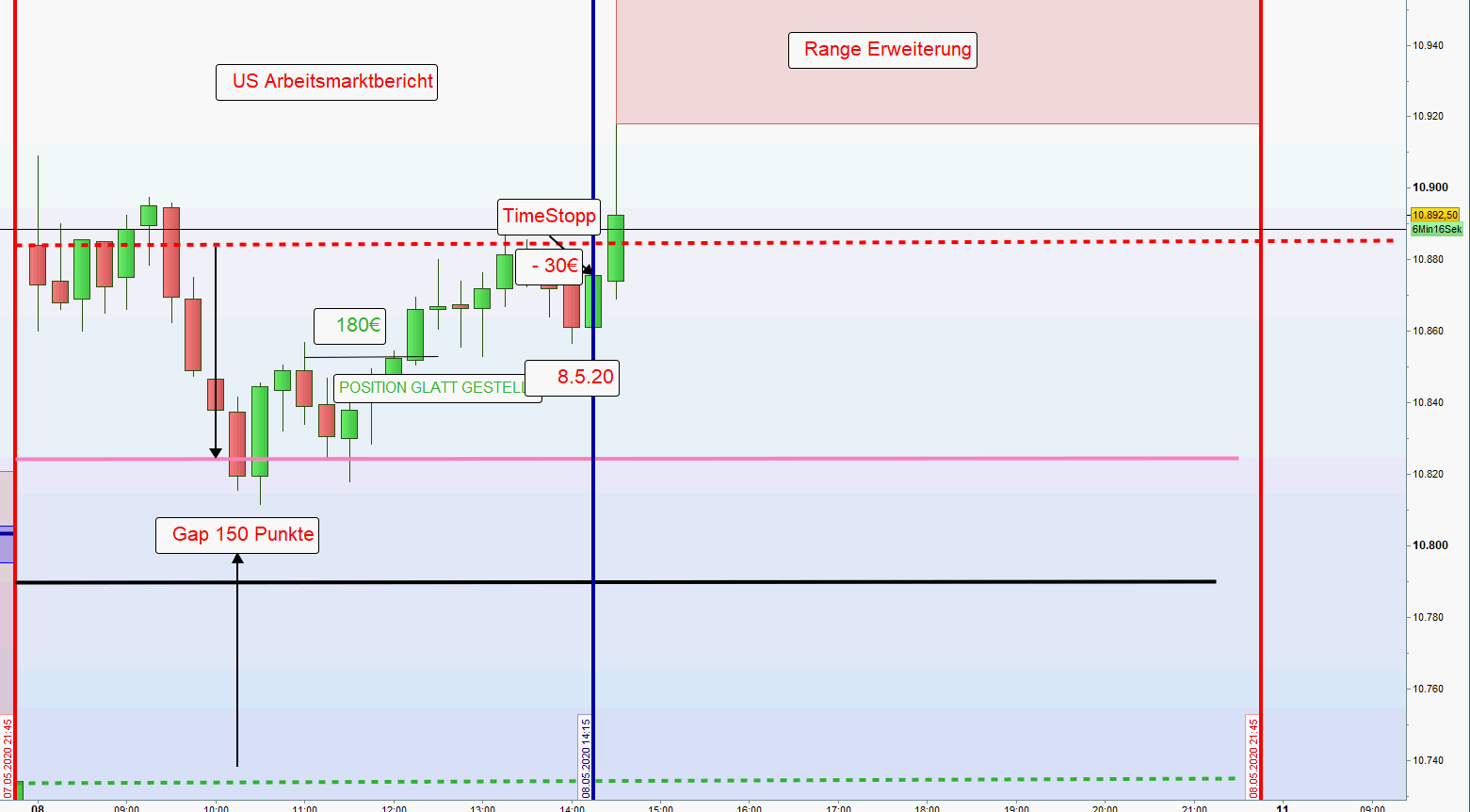 Notiert die Position Long aus der ersten Zone um 14:29 im Verlust dann Time Stopp