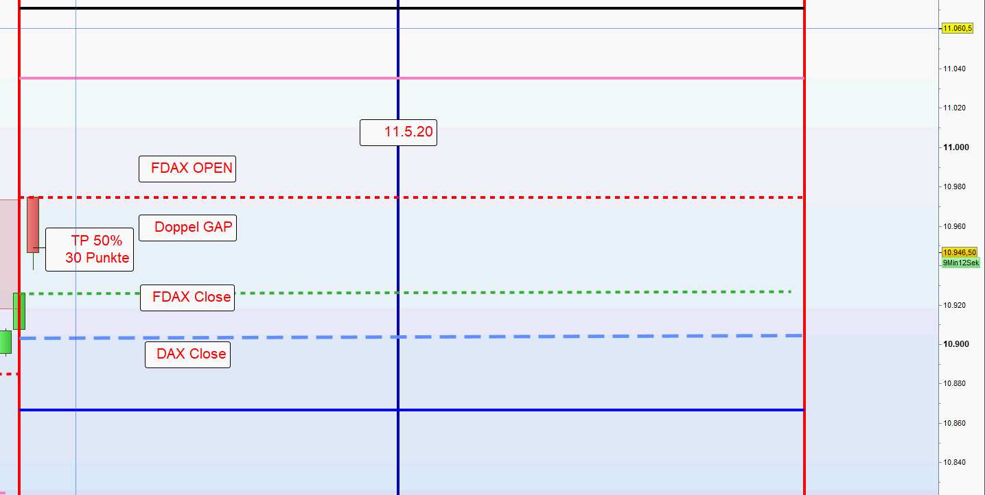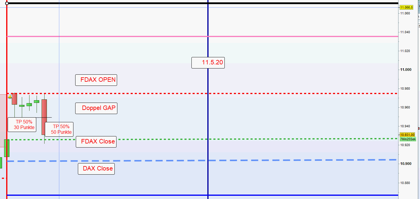 Eröffnungskurs. Läuft die Restposition weiter in den Gewinn dann Glattstellung nach einer Umkehrkerze.