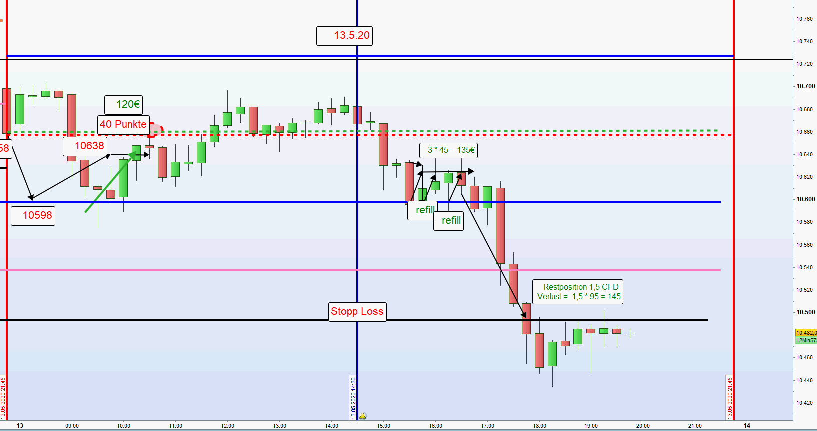 Als ich erwähnte, keine neue Longposition bedeutet dieses auch: Glattstellung der Restposition zum Einstandspreis. Das habe ich nicht erwähnt, und daher wird die Restposition von 1,5 CFD mit Vollverlust dokumentiert.