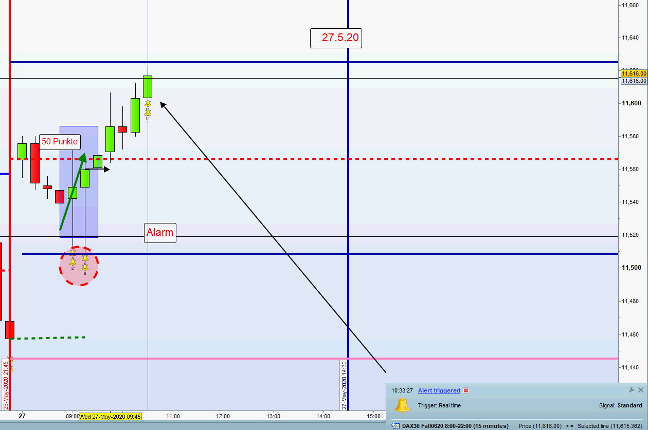 Wenn unter diesen Umständen auch noch die DOW FUT über 1 % steigen, dann muss die Position geschlossen werden. Insbesondere um den schon erzielten Gewinn zu sichern.
