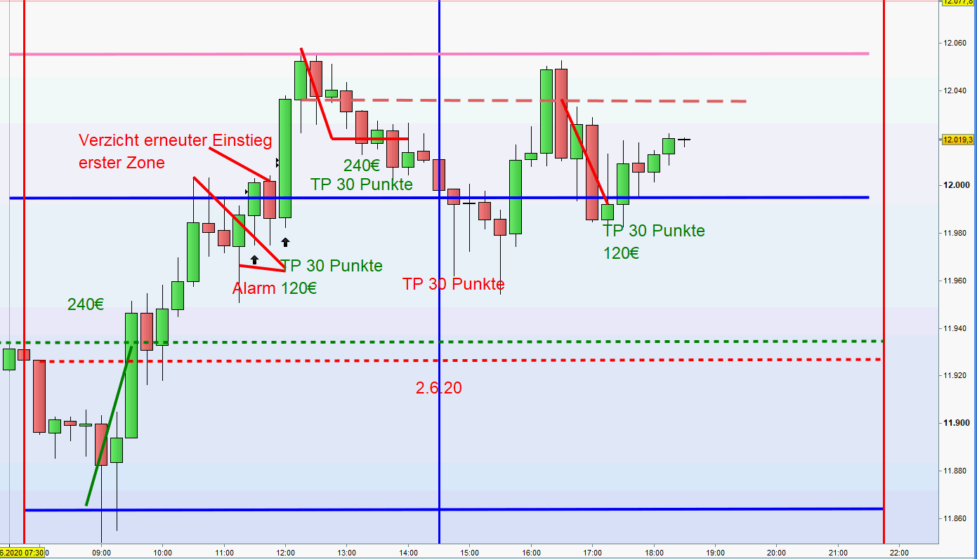Short und Long Während alle vorigen Setups für Positionseröffnungen präzise Vorgaben haben, findet dieser Handel in Nähe von Tageshoch/-tief in Richtung Mittelkurs statt. Tageshoch-tief kann auch auf einer Seite des Charts an der ersten oder zweiten Zone sein. Der Kurs kann auch in die Zone der Range Erweiterung gehandelt worden sein ohne in dieser zu schließen.