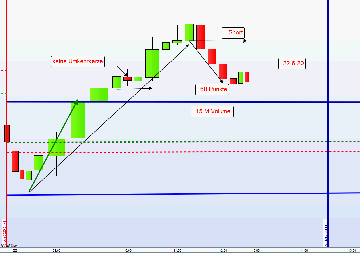 Notiert der Kurs entweder positiv oder negativ und eine heftige Gegenbewegung erreicht mit 3-4 15M Kerzen die erste gegenüber liegende Zone so eröffnen wir dort keine Position. Kein Einstieg ohne Umkehrkerze.