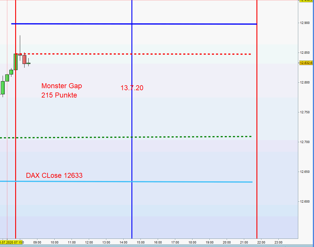 Heute hatten wir ein Doppel Gap. Dieses wird gehandelt in Richtung Gap Schließung. Ein Monster Gap, weil eine Übertreibung, hat auch die Tendenz zur Schließung der Gap. Ein Monster Gap kommt auch bei niedriger Volatilität unter 20 vor. Da dann aber die Zonen