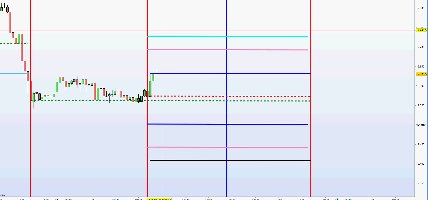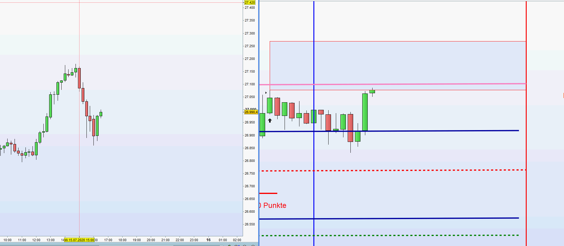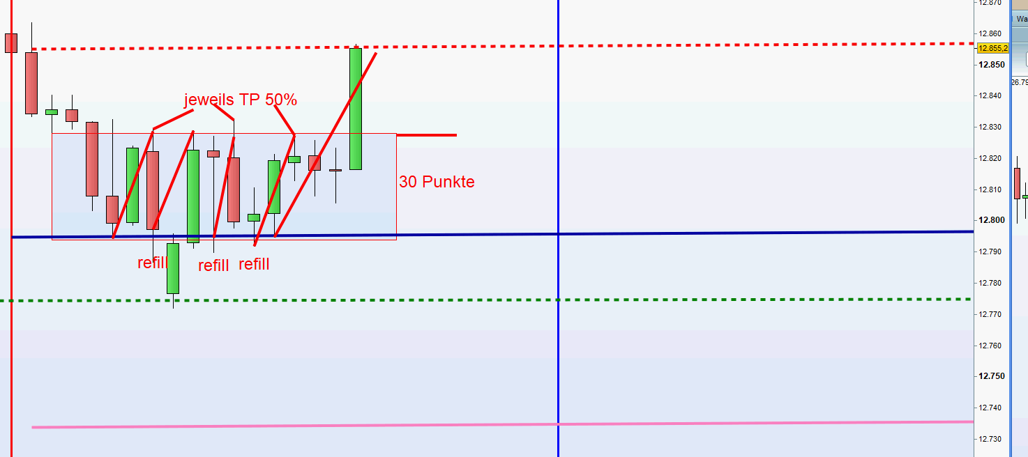 Es ist durchaus möglich, dass der Kurs bis 13:45h steigt aber auch das Gegenteil. Warten wir bis 9:00h ab. Long an der ersten Zone. US Futures im Minus. -