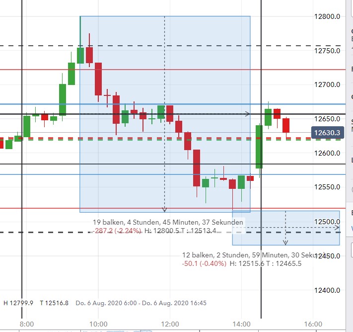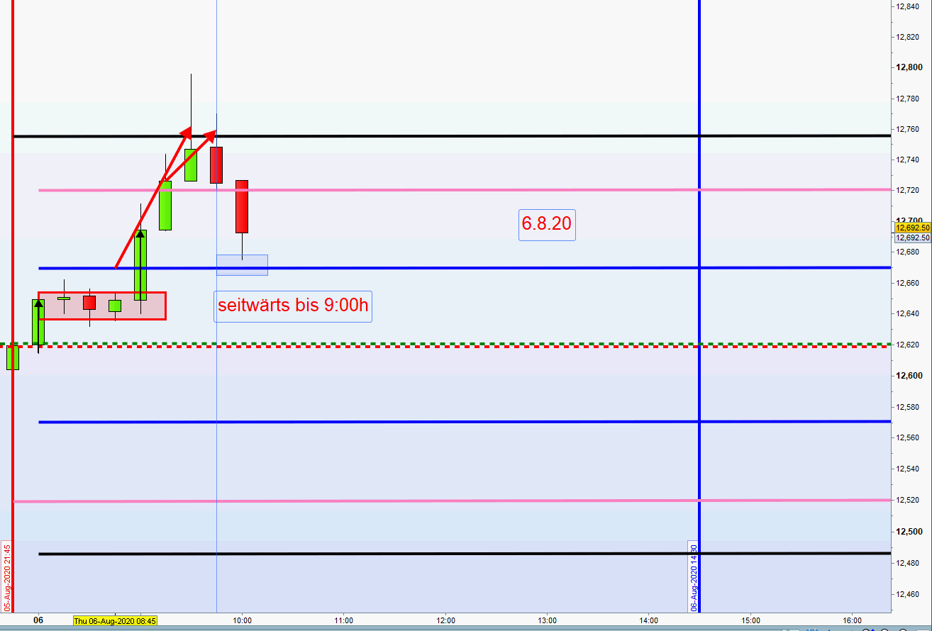 Die Kursdrehung vom Stopp loss am Hoch bis zur zweiten Zone Long kommt morgens sehr selten vor. Es ist dann höchste Vorsicht geboten und es wird dann auf ein Einstieg verzichtet. Von 13.00h bis 14:45h sowieso nicht.