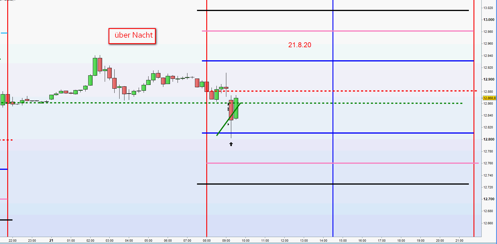 Einstieg mit M5 Umkehrkerze am vormittags Tief. (4 cfd) bei Rückkehr nach oben durch das Tief