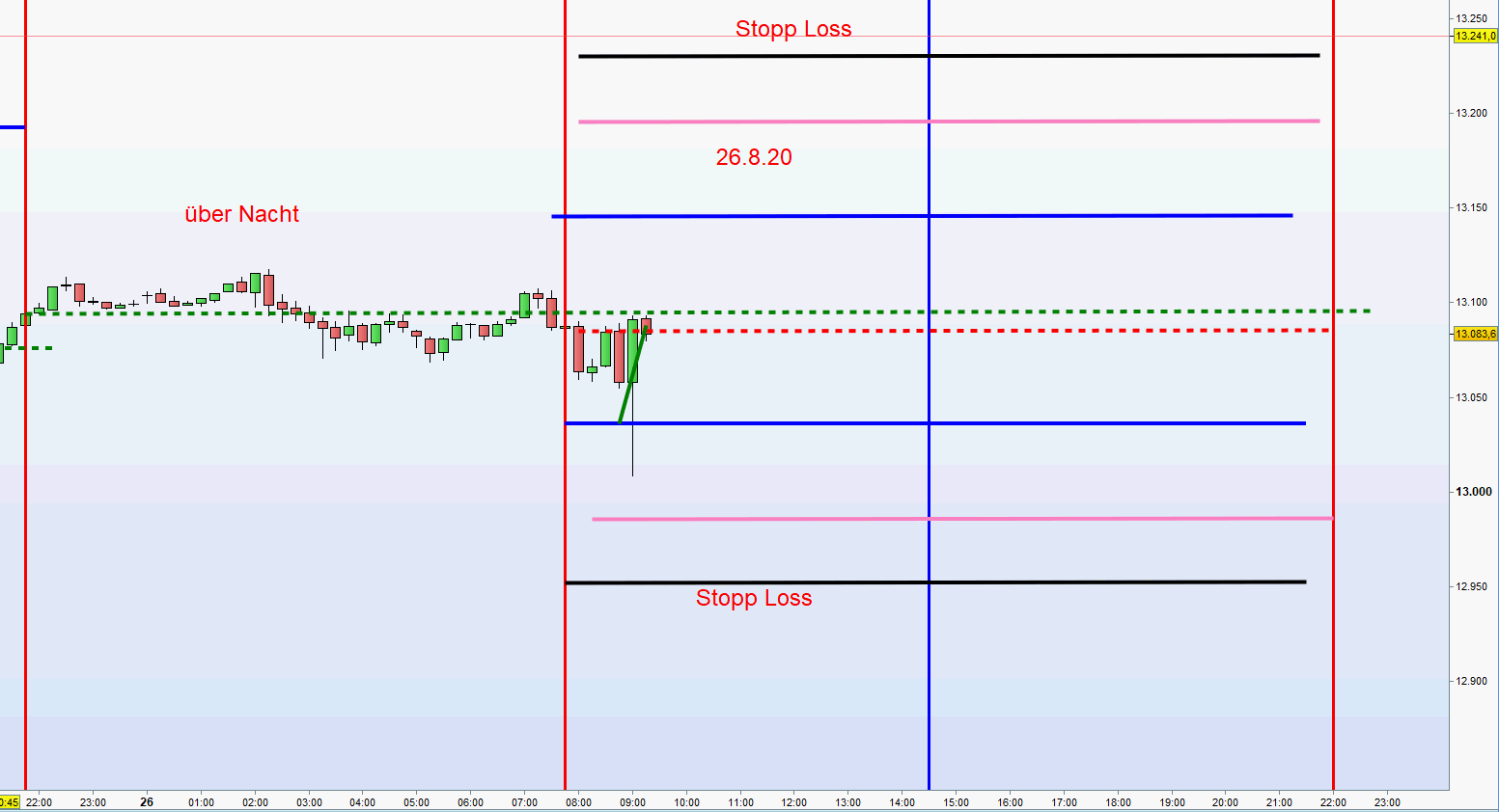 Hallo Georg,ich habe wie du die EUREX-Kurse und bei mir liegt der FDAX-Close 22h gestern bei 13084 und ist mit dem Open 8h bei 13083 quasi identisch.Hat das einen bestimmten Grund, dass du den Close etwa 10 Punkte höher eingezeichnet hast? Oder nimmst du den Close der letzten Kerze vor der Schlussauktion?War heute ja definitiv die richtige Entscheid bei 1. Zone Short.Viele Grüße,Jan