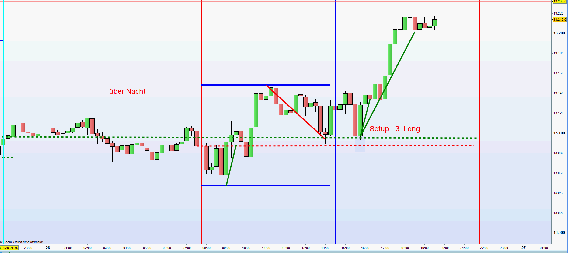 Mit dem Kurs und Chart von IG ist es ein Setup 3 Long und mit den FDAX Kursen ein Setup 1 Short. Einige Punkte Unterschied heute mit großer Wirkung. -