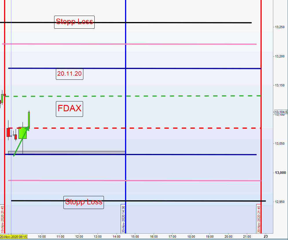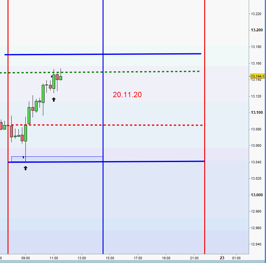 ich kann mich nicht beklagen, 2 Einstiege short, 1. bei 13238 zweiter bei 13278. Beide mit Gewinn geschlossen. Das System von Georg ist Gold wert, wenn man sich an die Regeln hält.