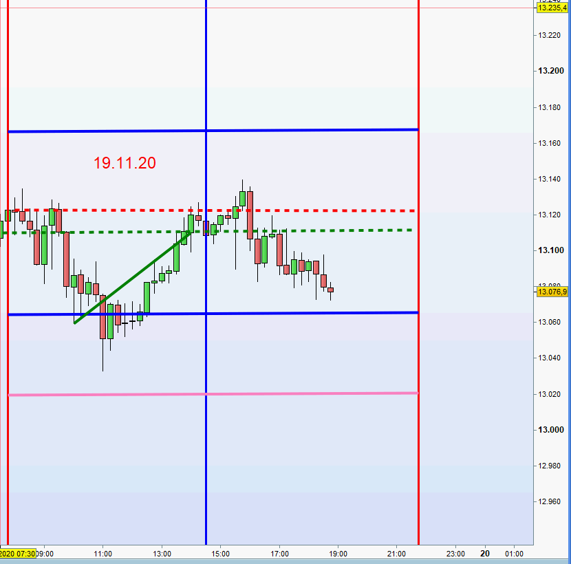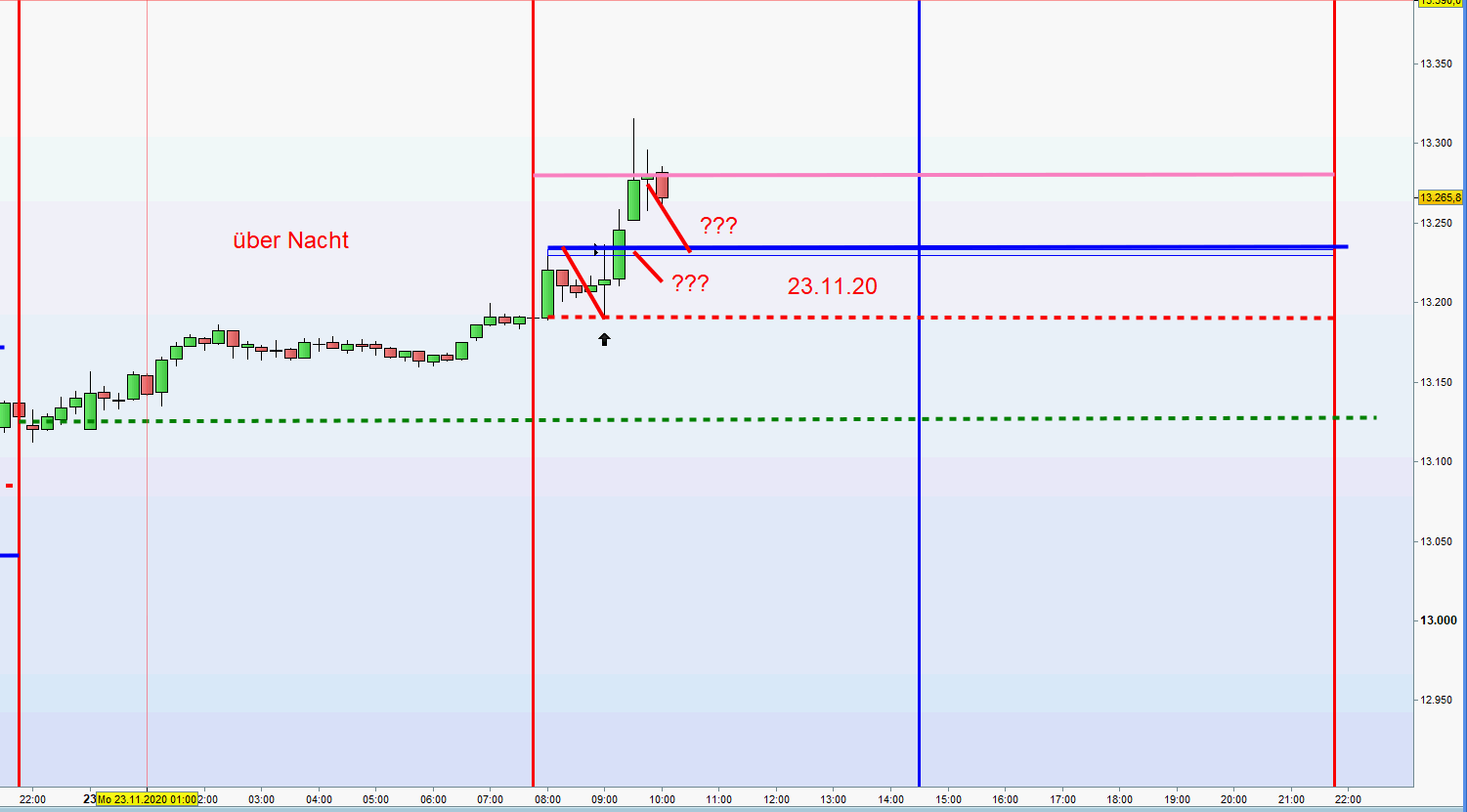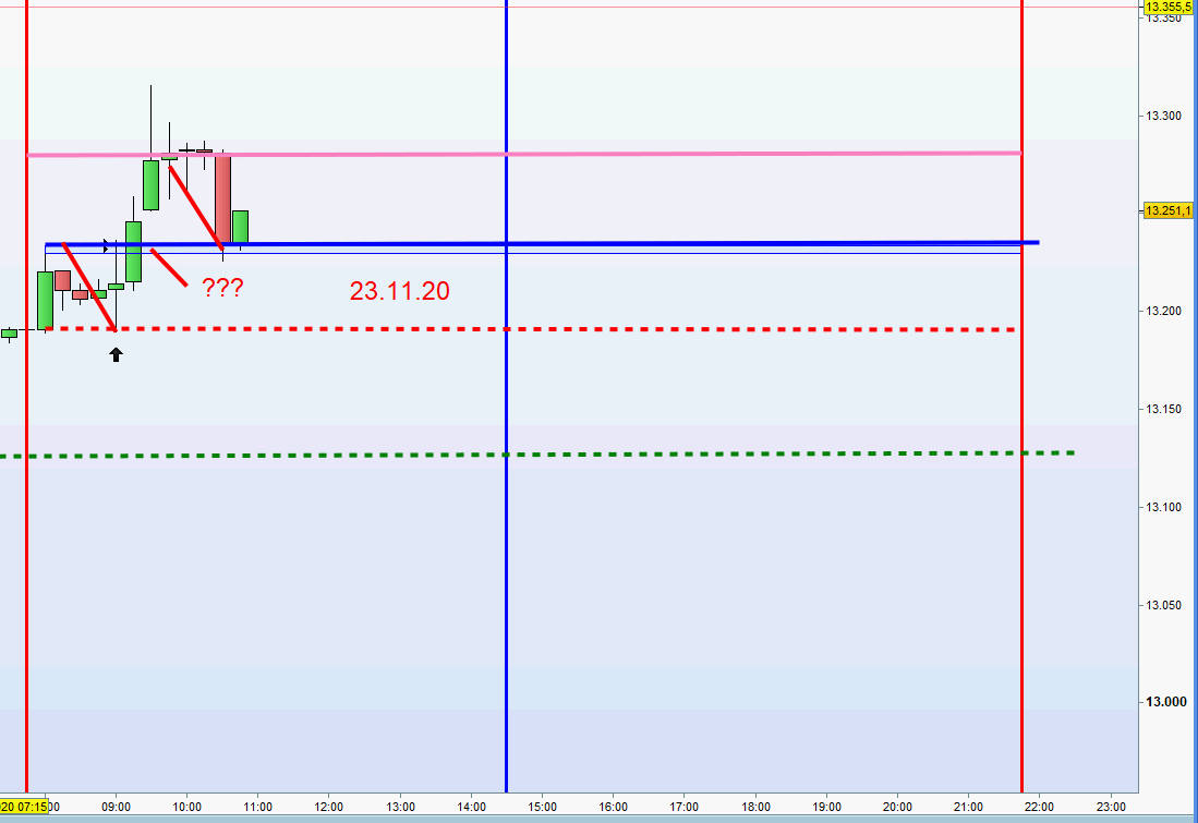 ich kann mich nicht beklagen, 2 Einstiege short, 1. bei 13238 zweiter bei 13278. Beide mit Gewinn geschlossen. Das System von Georg ist Gold wert, wenn man sich an die Regeln hält.