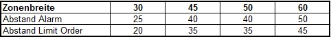 Ich hab mal das Forum durchforstet und mir folgende Abstände für die Alarme und Limitorders erschlossen. Lieg ich da richtig?