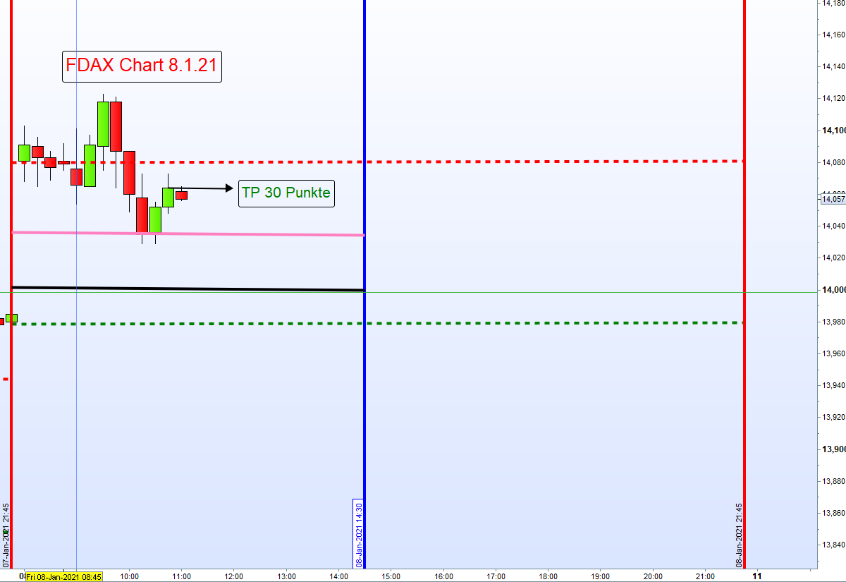 Grundsätzlich werden bis 14:30h Long Positionen gehandelt. Der Einstieg unterliegt strengen Kriterien: Sofortiger Einstieg Long um 8:00h wenn DOW Futures und FDAX positiv notieren oder auch steigender Kurs über dem Close vom DAX (XETRA) um 17:30h Vortag. Sind diese Voraussetzungen nicht gegeben, dann zuerst Eröffnung der Börse um 9:00h und Long Umkehrkerze abwarten. Dieser Einstieg ist dann die erste Zone Long. Teilgewinne (TP) zum Beispiel mit 30-50 Punkten, je nach Volatilität, können auch realisiert werden. Bei Rücksetzer kann Aufstockung erfolgen. An zweiter Zone Long Verdopplung der Position. -