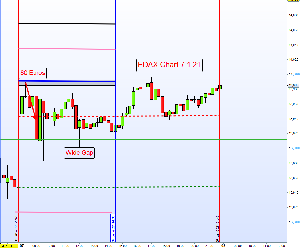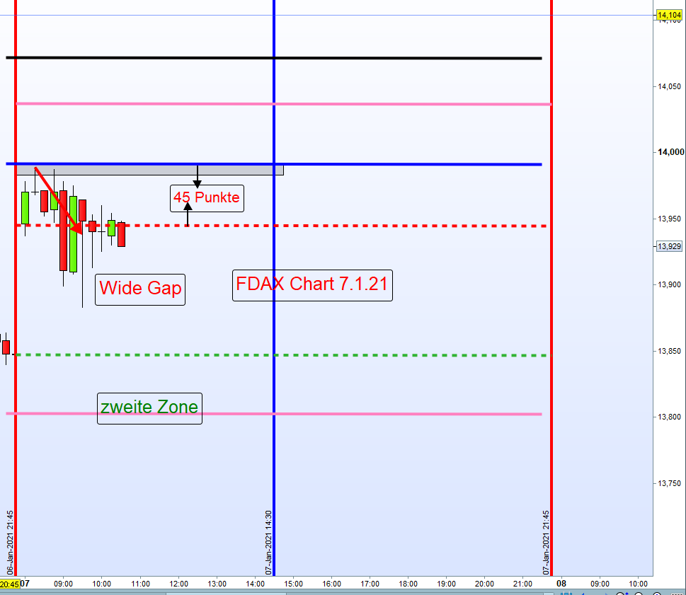 Wide Gap bleibt bestehen bis kurz vor 13:00h auch wenn auf der anderen Seite schon Trades erfolgten. Zwischen 13.00h und 14:45h keine Eröffnung von neuen Positionen. Danach nur Setups am Nachmittag.