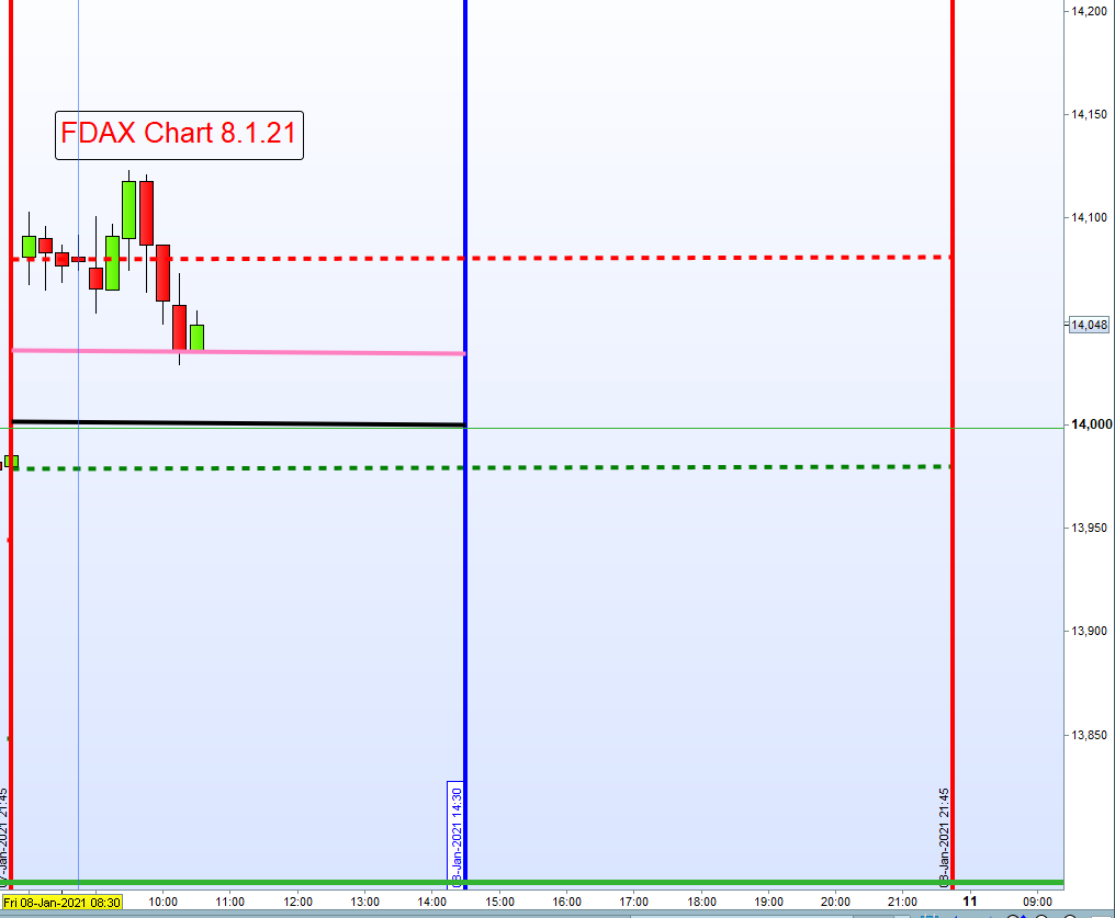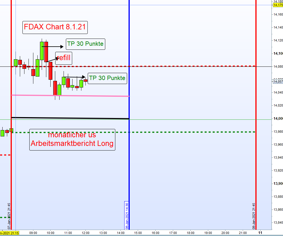 Grundsätzlich werden bis 14:30h Long Positionen gehandelt. Der Einstieg unterliegt strengen Kriterien: Sofortiger Einstieg Long um 8:00h wenn DOW Futures und FDAX positiv notieren oder auch steigender Kurs über dem Close vom DAX (XETRA) um 17:30h Vortag. Sind diese Voraussetzungen nicht gegeben, dann zuerst Eröffnung der Börse um 9:00h und Long Umkehrkerze abwarten. Dieser Einstieg ist dann die erste Zone Long. Teilgewinne (TP) zum Beispiel mit 30-50 Punkten, je nach Volatilität, können auch realisiert werden. Bei Rücksetzer kann Aufstockung erfolgen. An zweiter Zone Long Verdopplung der Position. -