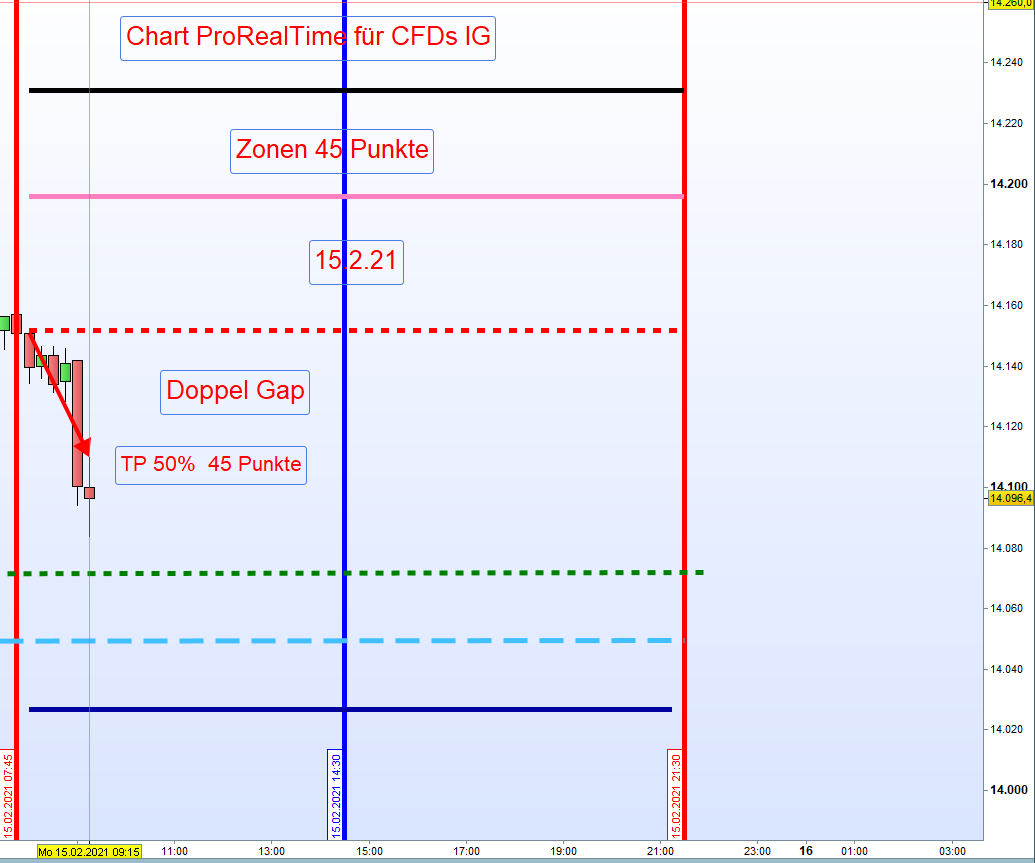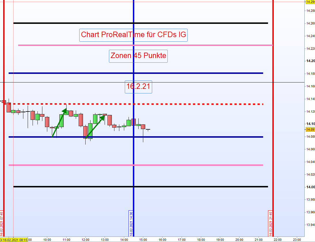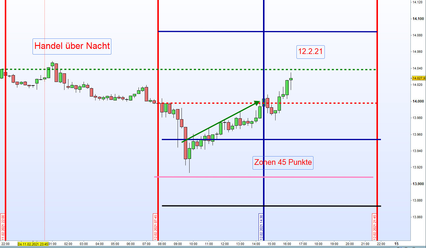 Zeitfaktor (ZF)Nach Eröffnung einer Position an einer Zone ist der Zeitfaktor in Verbindung mit Chartlesung für die Erfüllung des TP, Mitnahme von Teilgewinnen oder auch Ausstieg mit Breakeven aus der Position von höchster Wichtigkeit. Nur der diskretionäre Händler mit Übersicht und Erfahrung kann das Management der offenen Position richtig steuern.Eine Position die bereits 40 bzw 45 Punkte in einer Zone von 50 Punkten im Gewinn notiert lassen wie NIE in den Verlust laufen insbesondere wenn nach Eröffnung uns ausreichend Zeit zur Verfügung steht.