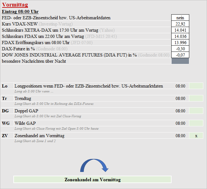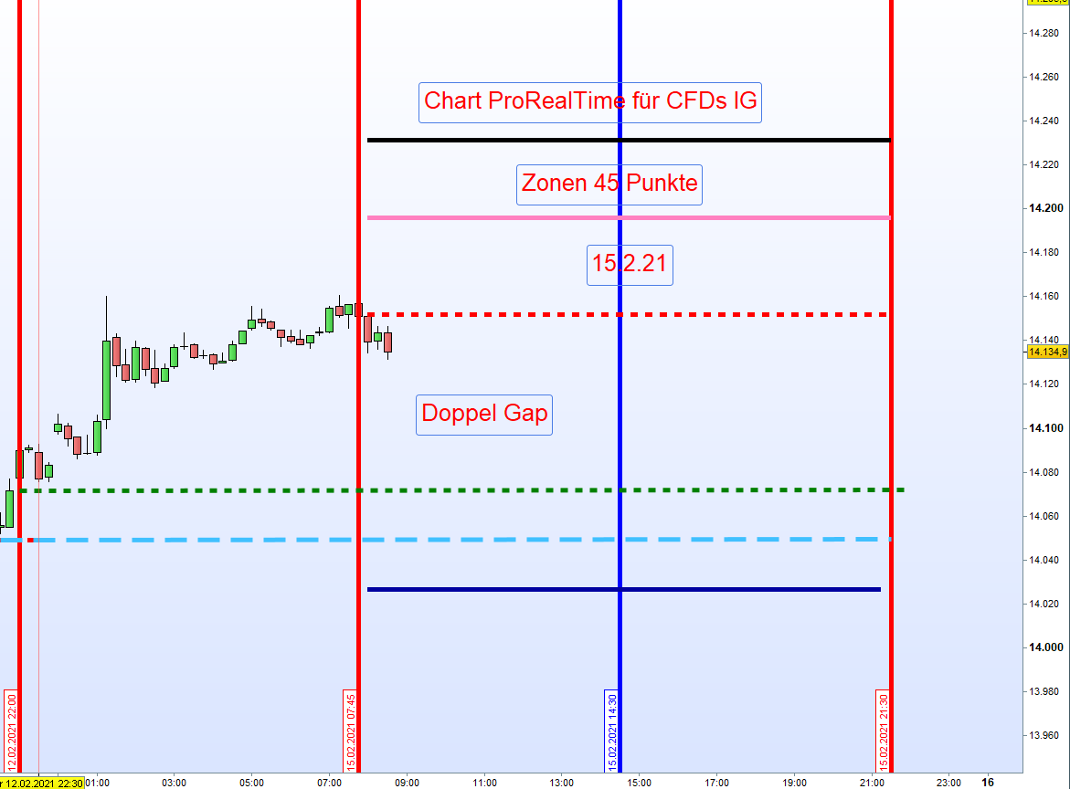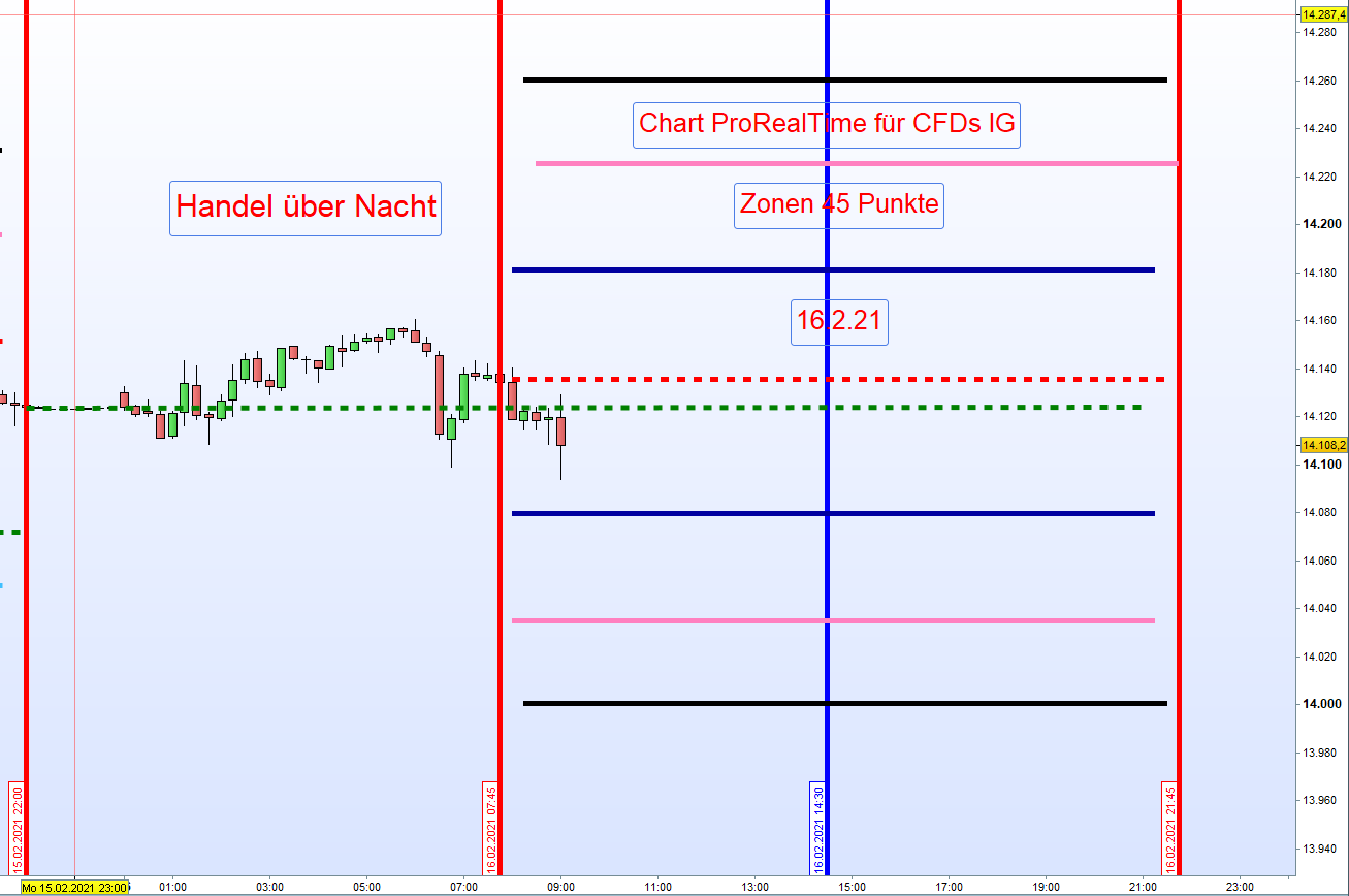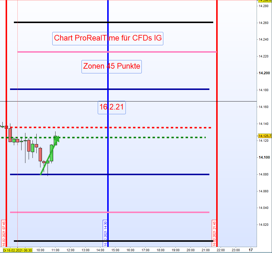 Zeitfaktor (ZF)Nach Eröffnung einer Position an einer Zone ist der Zeitfaktor in Verbindung mit Chartlesung für die Erfüllung des TP, Mitnahme von Teilgewinnen oder auch Ausstieg mit Breakeven aus der Position von höchster Wichtigkeit. Nur der diskretionäre Händler mit Übersicht und Erfahrung kann das Management der offenen Position richtig steuern.Eine Position die bereits 40 bzw 45 Punkte in einer Zone von 50 Punkten im Gewinn notiert lassen wie NIE in den Verlust laufen insbesondere wenn nach Eröffnung uns ausreichend Zeit zur Verfügung steht.