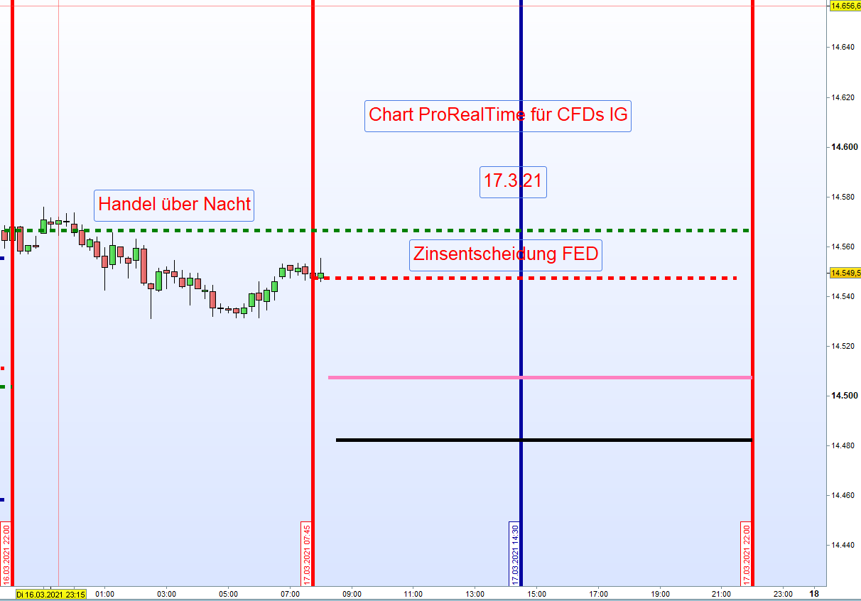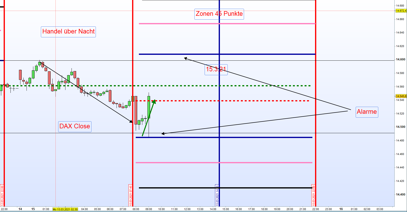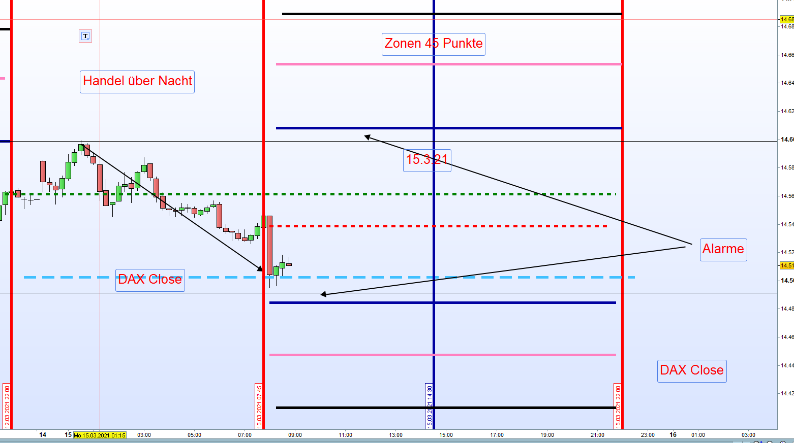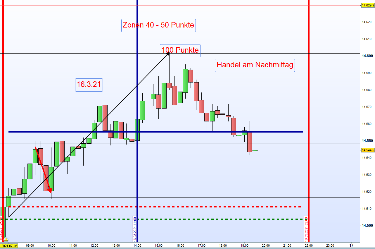 Wir belassen Zonen bei 40 -50 Punkten entsprechend der Intraday Handelsspanne mit einem DAX um die 14500.