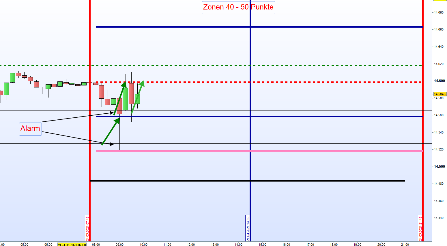 Alarm für Long 10 Punkte über der Zonenlinie und Limit Order 15 Punkte über Zonenlinie. Sofern Alarm tönt Limit Order abdrücken. Das ist wirklich keine Hexerei. Limit Order muss allerdings vorbereitet sein.
