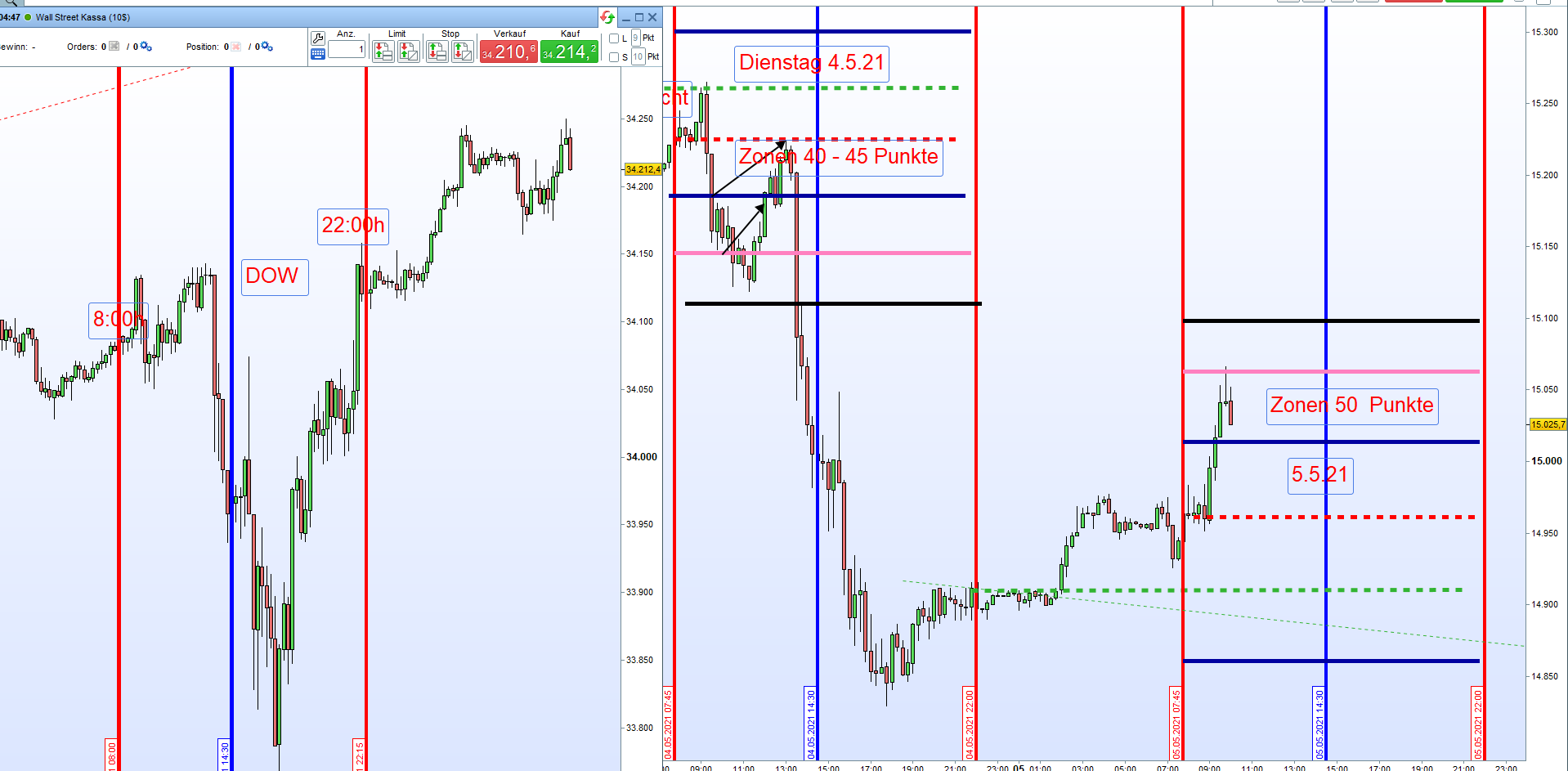 Nachdem festgestellt wurde, dass keine Kerze unter/über dem Open um 8:00 schloss und der Kurs durch die erste Zone durchgehandelt wurde, dann warten wir zum Einstieg erst einesignifikante Umkehrkerze ab.