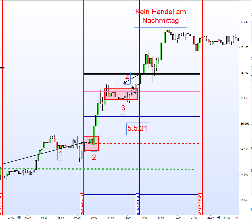 Der gestrige Handelstag ist ein gutes Beispiel zur Analyse. Betrachten wir den Chart und auch den Regeltext.