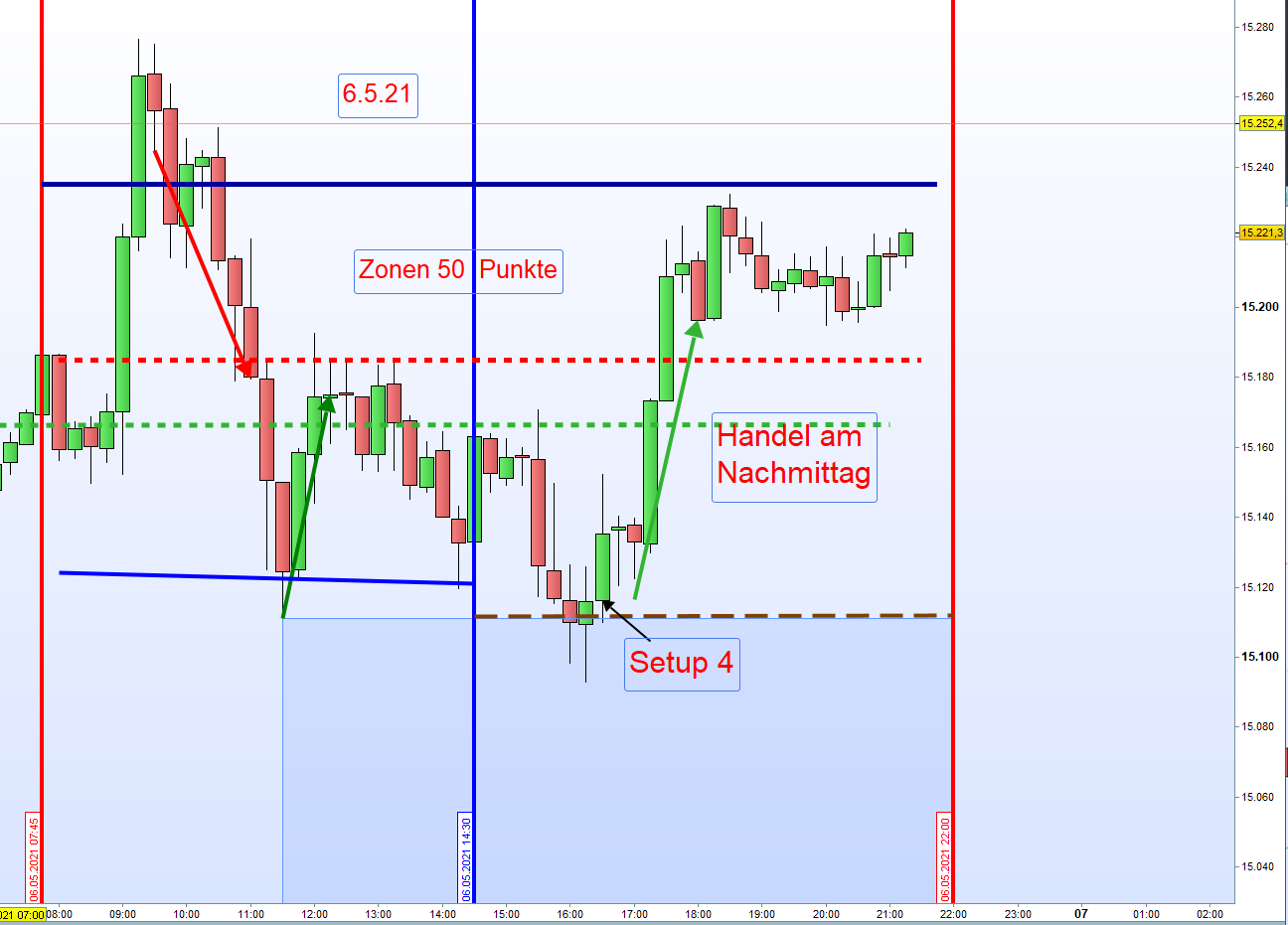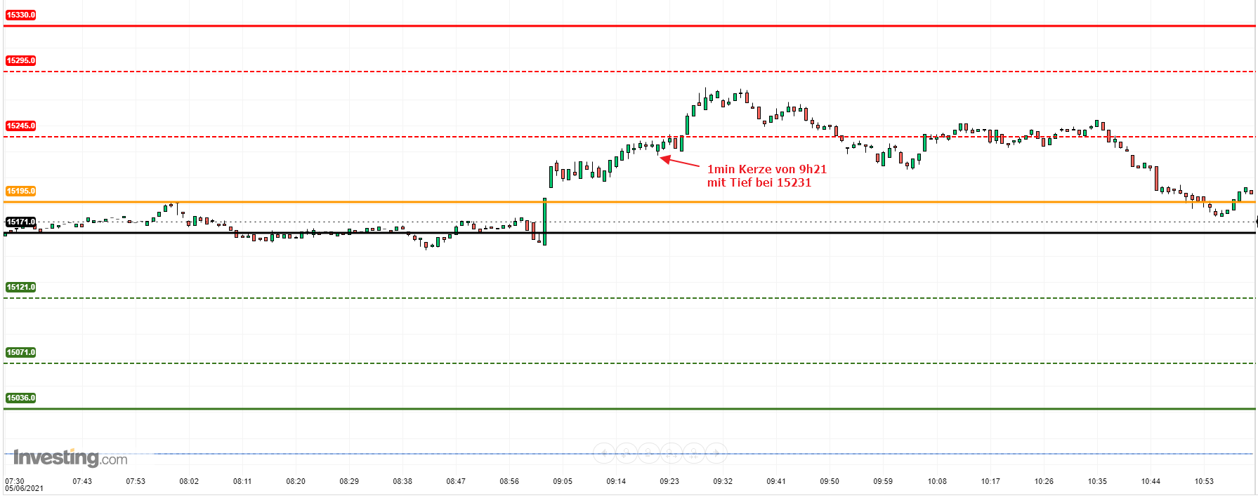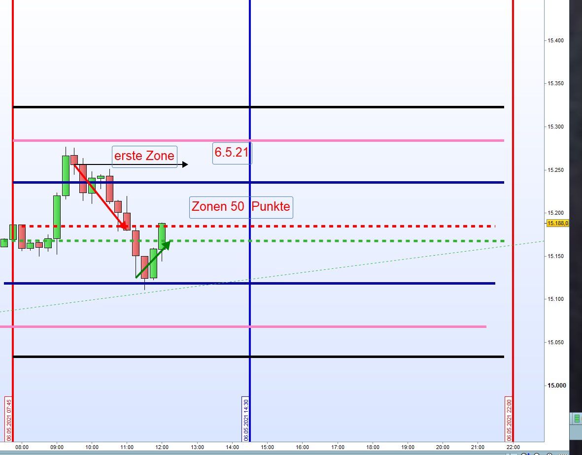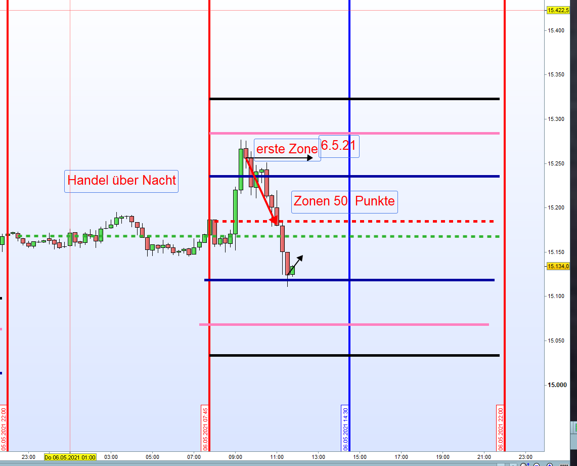 Beim Handel in Echtzeit wäre der Einstieg spätestens um 9h21 per "Alarm" erfolgt, nachdem die Zone-1 bei 15245 nicht ganz erreicht wurde.