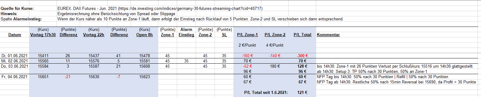 Verlustreich waren bei mir hauptsächlich der Nachmittagshandel, außer Setup 3.