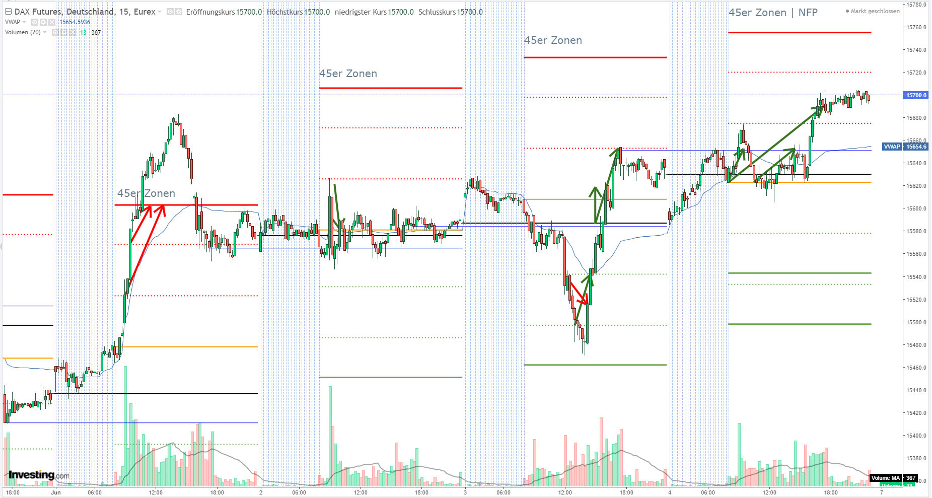 Da damit am Nachmittag dann also noch 50% der NFP Long Position im Rennen war, die mit Open-8h Kurs (15623) eröffnet wurde, kam dann das Setup 3 nicht mehr in Frage, welches mit schlechterem Close-22h Kurs (15630) hätte eröffnet werden müssen ("wir kaufen nie schlechter nach").