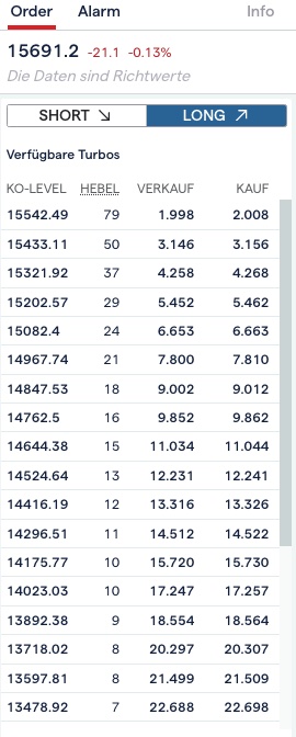 Der Punktwert für 100 Turbos ist immer 1 EUR. Nur der "Preis" (Margin) wird um so höher, je weiter der KO entfernt ist. Damit kann man auch wieder absurde Hebel von 100 traden, was bei CfD ja verboten wurde